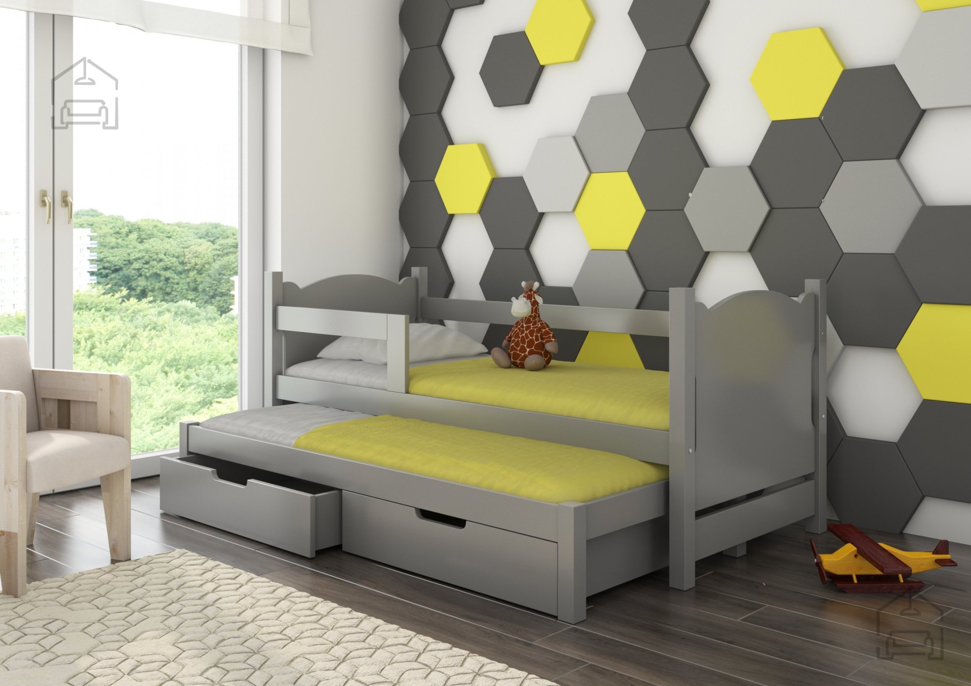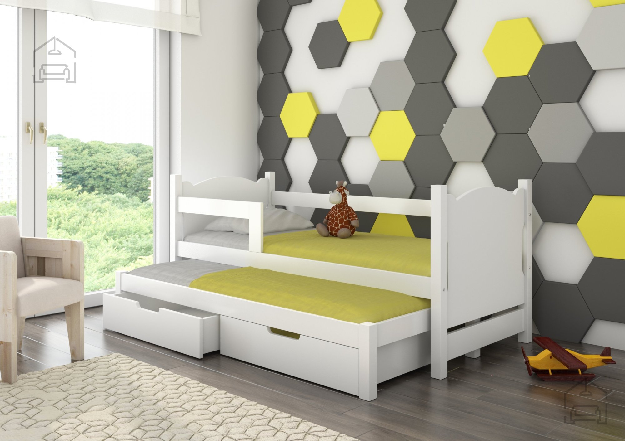 Wenn Sie ein Kinderbett mit zusätzlicher Liegefläche suchen, das Praktikabilität, Komfort und ansprechendes Design vereint, ist dieses Modell genau das Richtige. In einem Möbelstück erhalten Sie ein stilvolles Bett, eine Gästeliege und geräumige Schubladen zur Aufbewahrung. Durch die neutralen Farben lässt es sich problemlos in jedes bestehende Kinderzimmer integrieren. So sparen Sie Platz, schaffen eine gemütliche Schlafumgebung und ein harmonisches, aufgeräumtes Zimmer für Ihr Kind.