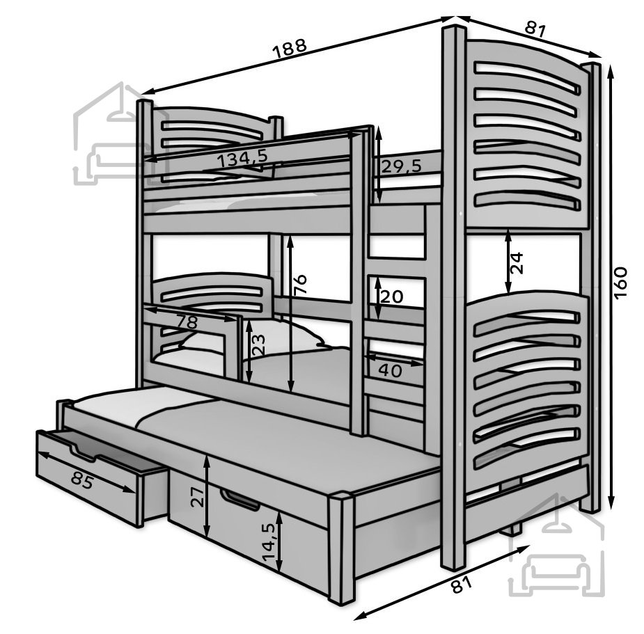 Das Bett besteht aus Kiefernholz und hochwertigem MDF, was es besonders langlebig und stabil macht. Die maximale Belastung pro Liegefläche beträgt 70 kg – perfekt geeignet für Kinder und Jugendliche. Alle Kanten sind abgerundet, was die Sicherheit zusätzlich erhöht, besonders bei jüngeren Kindern.