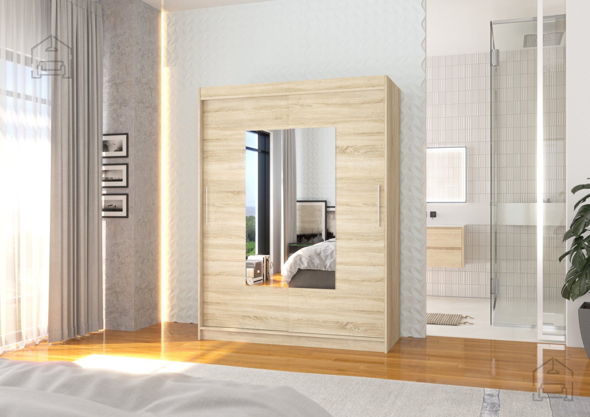 Die Maße von 150x58x200 cm machen den Schrank vielseitig einsetzbar – ganz gleich, ob in einem großzügigen Schlafzimmer oder in einem kleineren Flur. Schiebetüren sind besonders praktisch, da sie beim Öffnen keinen zusätzlichen Platz benötigen. Die Aluminiumlaufleisten sorgen für ein sanftes und leises Gleiten. Der große Spiegel an der Tür ist nicht nur funktional, sondern lässt den Raum auch größer und heller wirken.