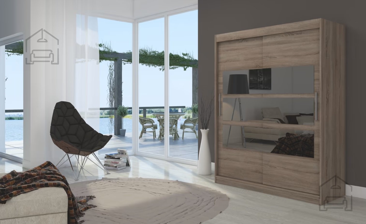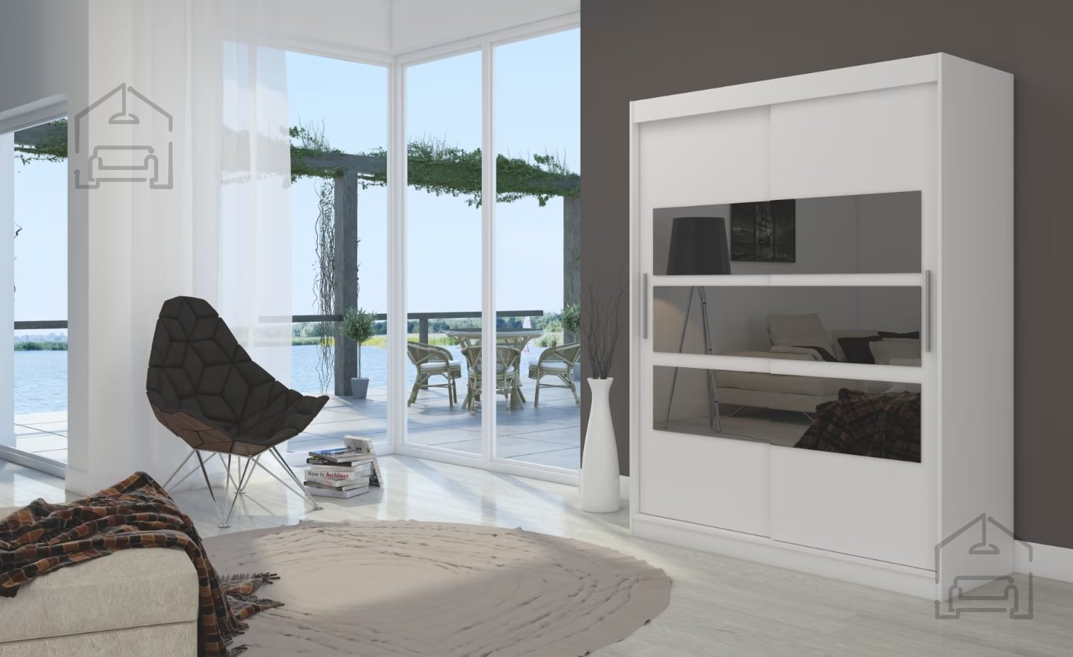 Der Schrank überzeugt mit Schiebetüren, die nicht nur ein modernes Gestaltungselement sind, sondern auch eine praktische Lösung für kleinere Räume bieten. Das Schiebesystem auf Aluminium-Schienen sorgt für ein sanftes und leises Öffnen – angenehm und einfach in der Handhabung. Der eingebaute Spiegel an der Tür lässt den Raum größer wirken und ist gleichzeitig ein praktischer Helfer beim täglichen Ankleiden.
