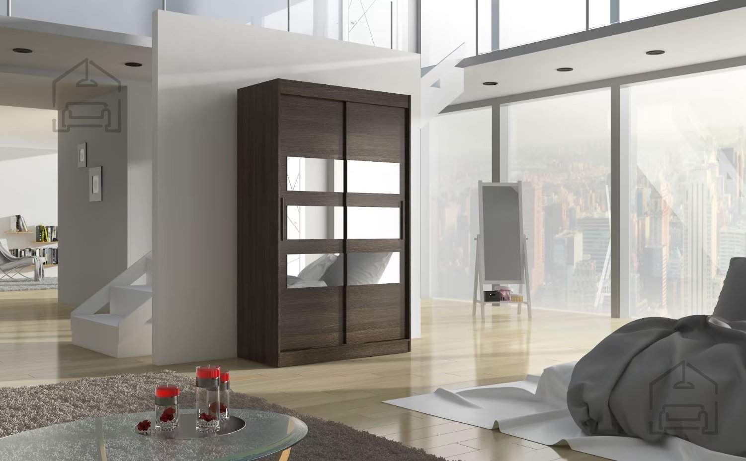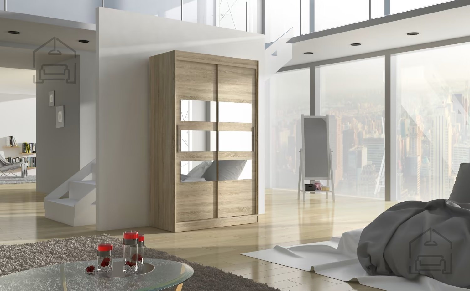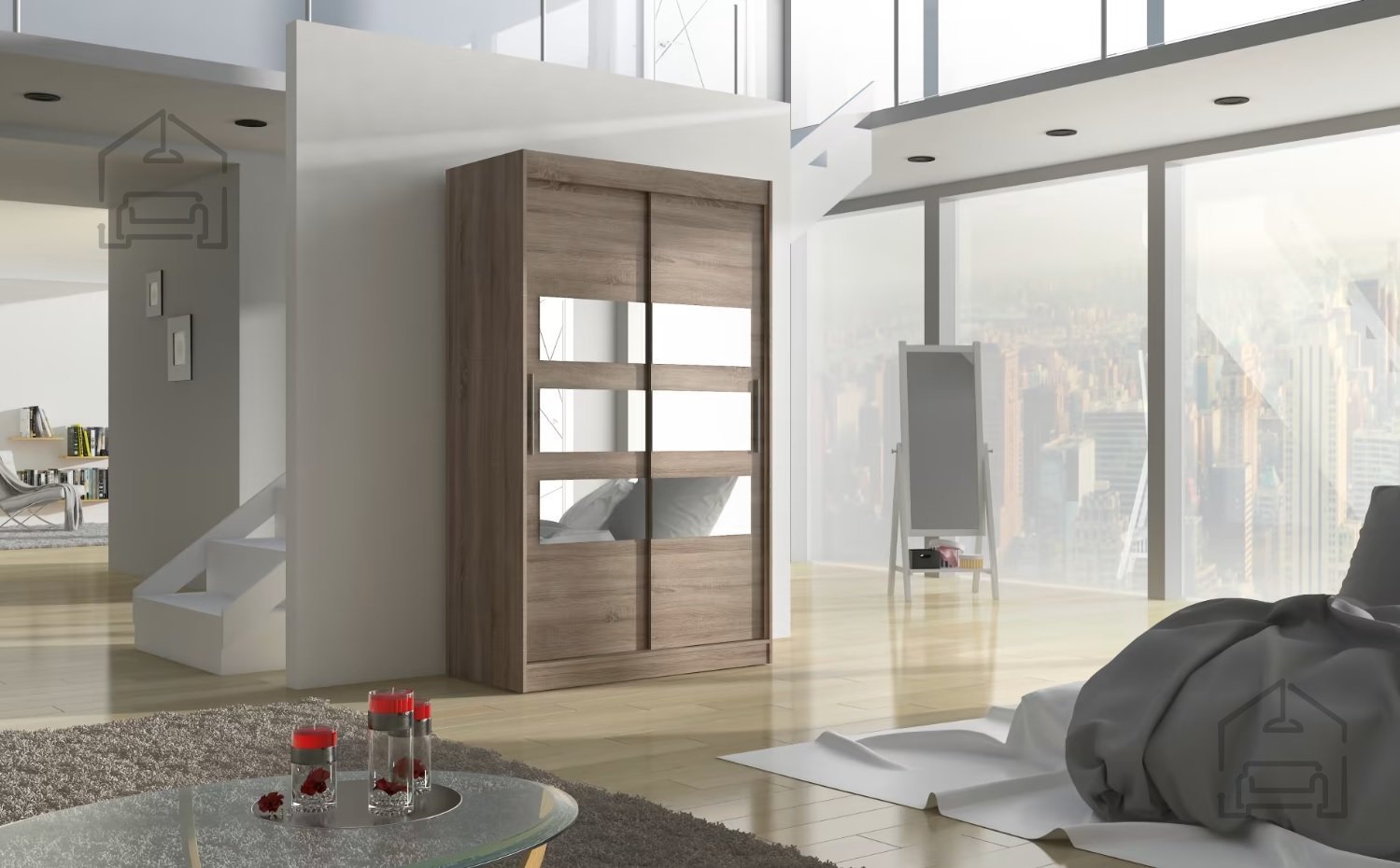 Die Schiebetüren sind nicht nur praktisch, da sie auch in kleineren Räumen leicht zu öffnen sind, sondern überzeugen ebenso durch ihr elegantes Design. Aluminium-Schienen sorgen für ein leises und geschmeidiges Gleiten, wodurch die Nutzung angenehm und unkompliziert ist. Zusätzlich verfügt der Schrank über ein Spiegelpaneel, das den Raum optisch vergrößert und ihm mehr Helligkeit sowie einen modernen Touch verleiht. Besonders praktisch ist das im Vorzimmer, um vor dem Hinausgehen noch schnell den Look zu überprüfen, oder im Schlafzimmer, wo der Spiegel ein zusätzliches Möbelstück ersetzt.