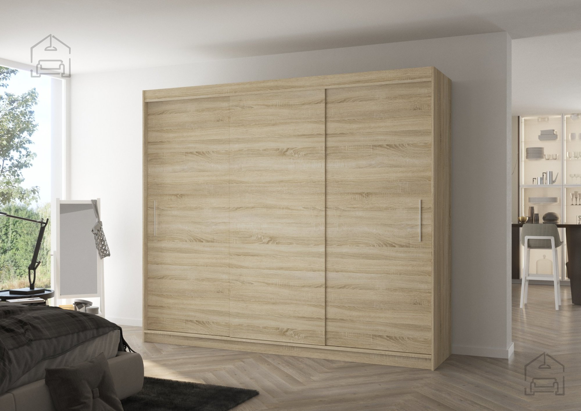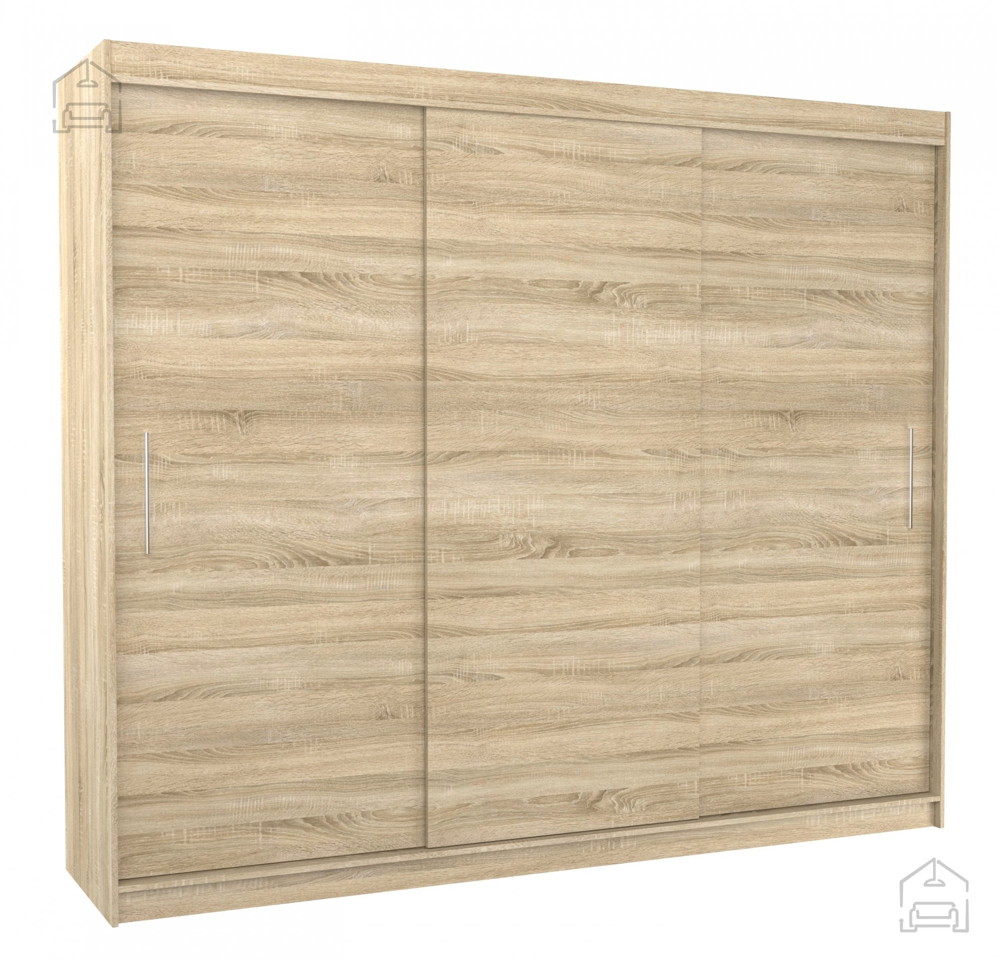 Die perfekte Lösung für alle, die sich eine geräumige, funktionale und zugleich stilvolle Aufbewahrung für ihre Kleidung wünschen, ist dieser Kleiderschrank mit Schiebetüren in elegantem Sonoma-Eichen-Dekor. Mit einer Breite von 250 cm und einer Höhe von 215 cm bietet er außergewöhnlich viel Stauraum, ohne durch die Schiebetüren zusätzlichen Platz im Raum zu beanspruchen. Damit ist er sowohl für größere Schlafzimmer als auch für kleinere Räume ideal geeignet, wo jeder Quadratmeter zählt.