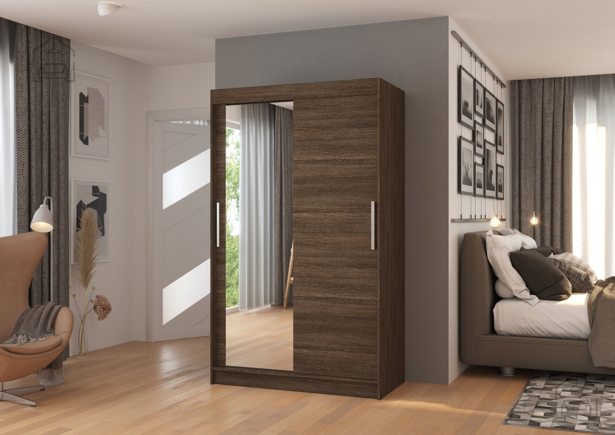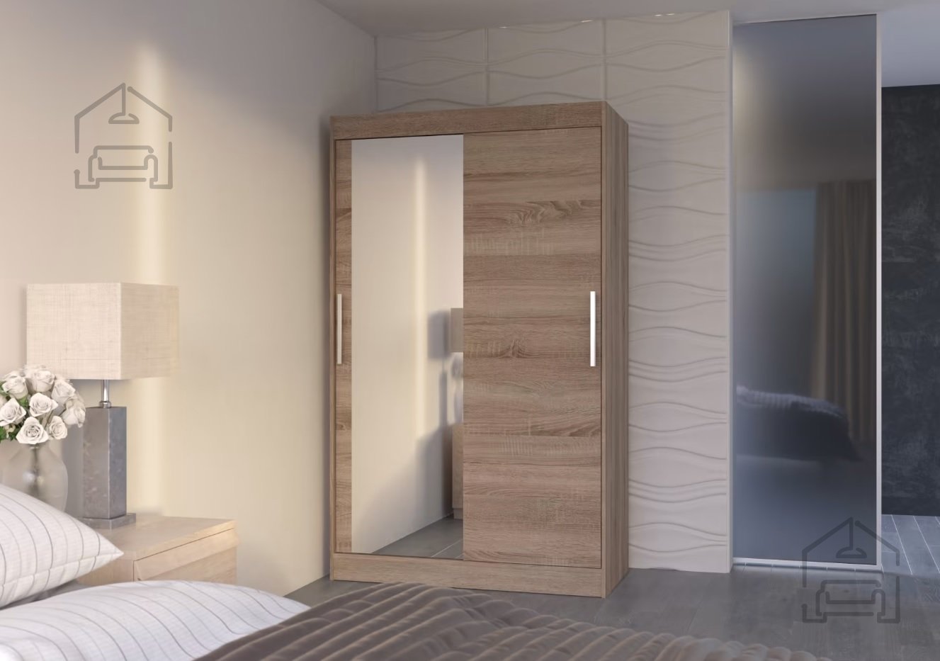 Der Schrank mit den Maßen 120x58x200 cm ist so konzipiert, dass er den vorhandenen Platz optimal nutzt und ausreichend Stauraum für Kleidung, Schuhe oder Accessoires bietet. Die Schiebetüren lassen sich leicht öffnen – auch in kleineren Räumen, wo klassische Drehtüren oft im Weg sind. Gerade diese praktische Lösung macht den Schrank zu einer hervorragenden Wahl für moderne Wohnungen.