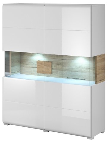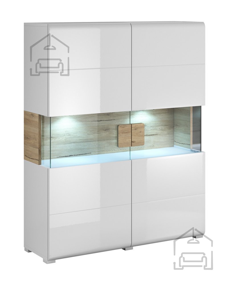 Die Vitrine Toledo mit den Maßen 122x39x152 cm besteht aus MDF-Platten und ist durchdacht sowie modern gestaltet. Sie verleiht Ihrem Wohnzimmer einen völlig neuen Charakter und lässt sich perfekt mit weiteren passenden Möbelstücken aus der Serie Toledo kombinieren, die Sie in unserem Online-Shop Moebelundmoebel.at finden. Der elegante weiße Korpus in Hochglanzoptik in Kombination mit San-Remo-Eiche und optionaler LED-Beleuchtung sorgt vor allem abends für eine stimmungsvolle Atmosphäre. Zudem bietet die Toledo-Vitrine großzügigen Stauraum. Besondere Lieblingsstücke können Sie stilvoll im verglasten Teil präsentieren.