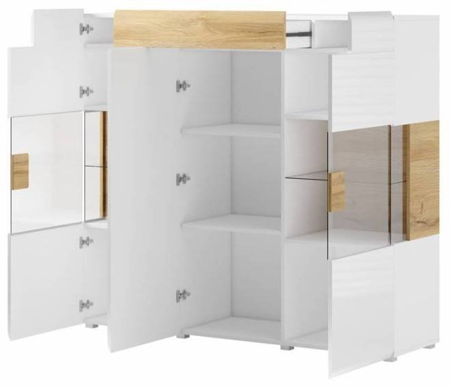 Die Kommode Toledo 4 ist mehr als nur ein Möbelstück – sie ist eine Investition in Stil und Funktionalität für Ihr Zuhause. Durch die elegante Farbkombination und die optionale LED-Beleuchtung bringt sie Modernität und Wärme in jeden Raum. Dank ihres großzügigen Stauraums können Sie alles von Büchern bis hin zu Dekoartikeln ordentlich verstauen, während die Glastüren einen Hauch von Eleganz verleihen und Ihre Lieblingsstücke schön in Szene setzen.