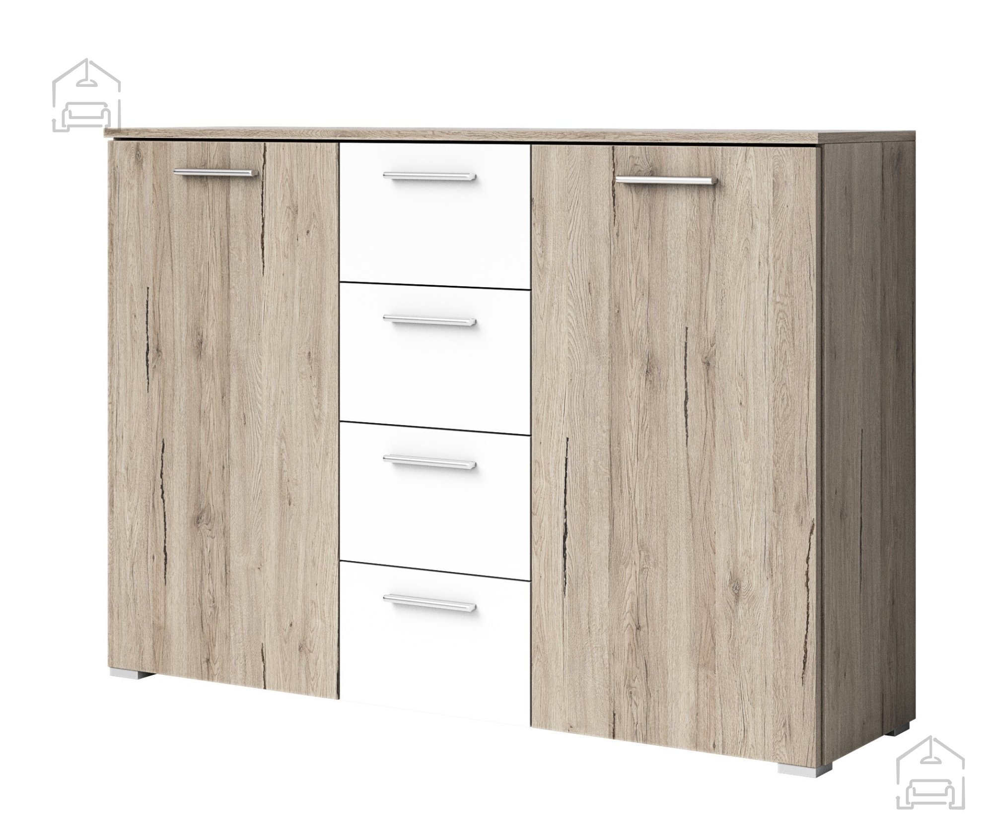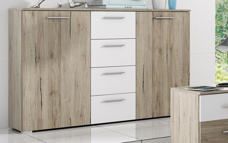 Die Kommode Beta ist weit mehr als nur ein Möbelstück – sie ist ein kleines Kunstwerk, das Ordnung und Harmonie in Ihr Zuhause bringt. Mit ihrem cleveren Aufbau, bestehend aus vier geräumigen Schubladen in der Mitte und jeweils einem Schrank auf beiden Seiten, bietet sie jede Menge Stauraum für Kleidung, Deko oder Alltagsgegenstände.