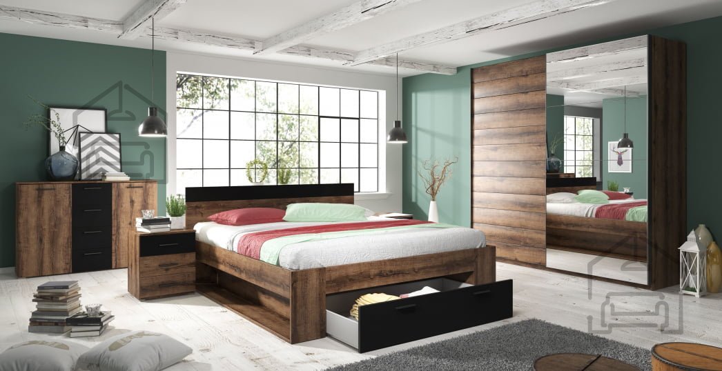 Der Schrank besticht durch die elegante Kombination aus dunkler Eiche und Schwarz. Der Korpus in dunkler Eiche verleiht dem Raum Wärme und eine natürliche Note, während die schwarzen Fronten einen modernen Kontrast schaffen, der alle Blicke auf sich zieht. Diese harmonische Farbgestaltung fügt sich mühelos in verschiedenste Einrichtungsstile ein – von klassisch bis modern.