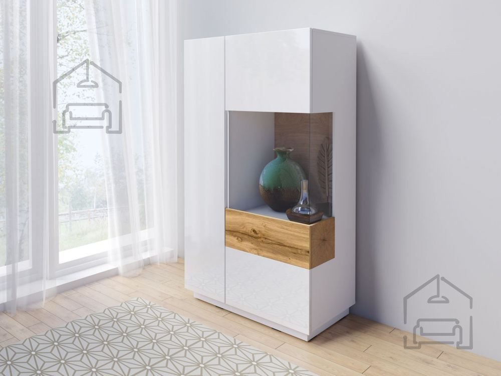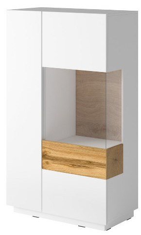 Die Vitrine Silke besteht aus robustem MDF-Material, das für Langlebigkeit und Stabilität sorgt. Die Kombination aus Weiß und Eiche Wotan verleiht ihr eine zeitlose Optik, die sich harmonisch in unterschiedliche Wohnstile einfügt. Der weiße Korpus bringt Frische und Leichtigkeit in den Raum, während die Eiche-Details Wärme und Raffinesse hinzufügen.