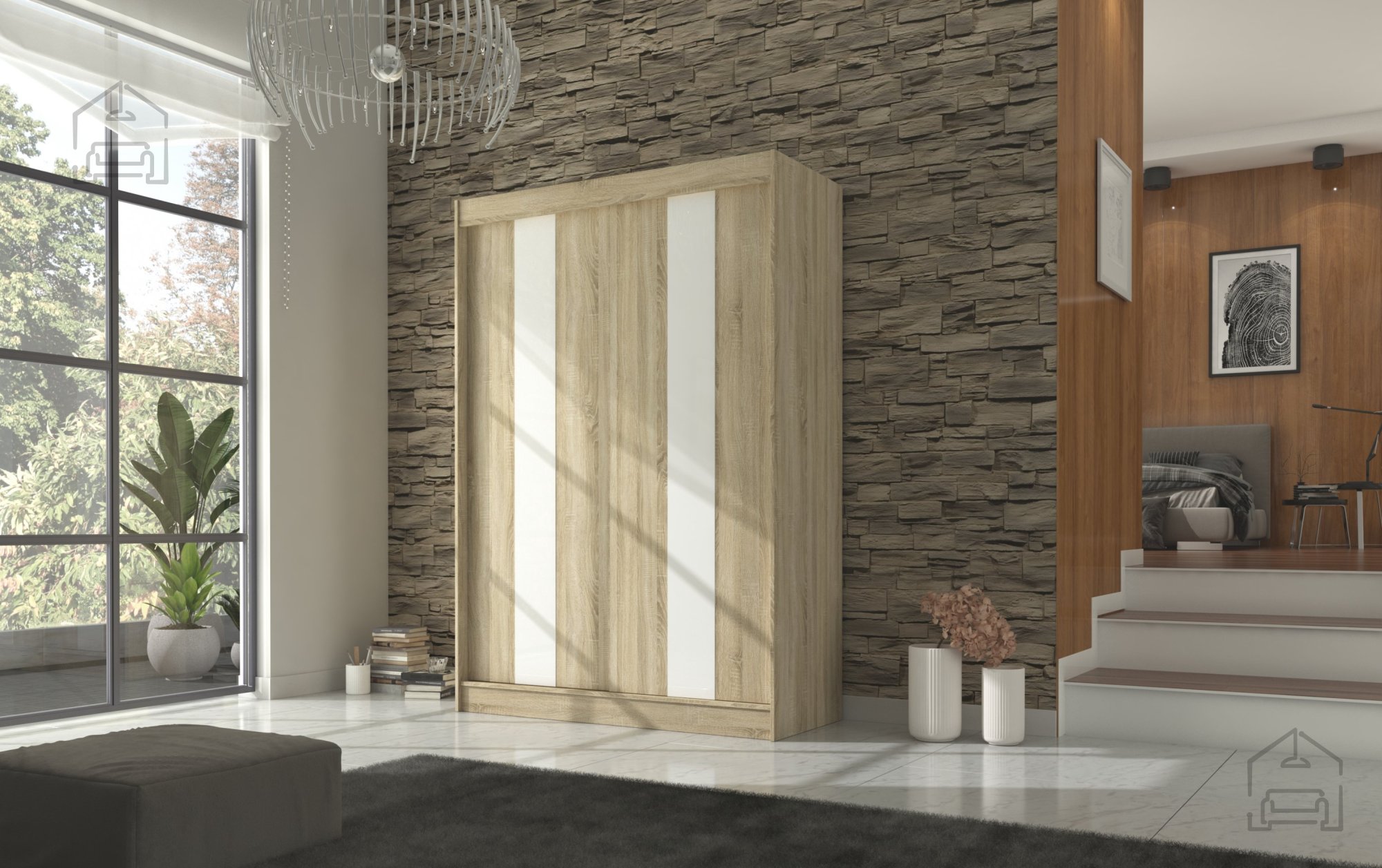 Der Schrank ist in mehreren Farbkombinationen erhältlich: Eiche/Weiß, Schwarz/Weiß, Weiß/Schwarz sowie Eiche/Schwarz. Dank dieser vielfältigen Varianten fügt er sich harmonisch in unterschiedliche Einrichtungsstile ein – von klassisch bis modern-minimalistisch. Die Schiebetüren sorgen für ein elegantes Erscheinungsbild und sind zugleich äußerst praktisch, da sie beim Öffnen keinen zusätzlichen Platz benötigen. Damit ist der Schrank auch für kleinere Räume ideal geeignet, in denen jeder Zentimeter zählt.