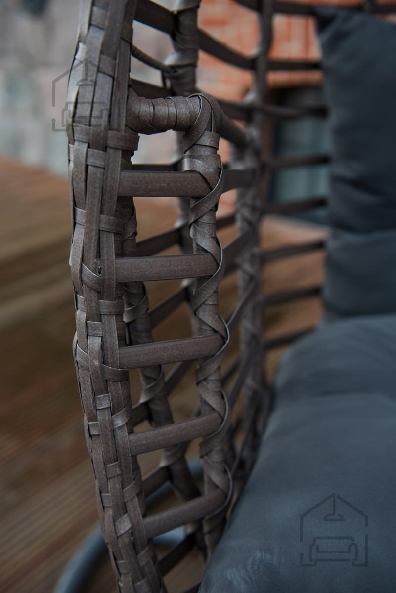 Das Gestell des Sessels besteht aus einer leichten Aluminiumkonstruktion, die Stabilität und einfaches Umstellen gewährleistet. Das Metall ist korrosionsbeständig, sodass der Sessel auch nach mehreren Saisonen im Freien in bestem Zustand bleibt. Die Außenfläche ist mit hochwertigem Technorattan (7–8 x 1,2 mm) umwoben, das für seine Wetterfestigkeit bekannt ist. Dieses synthetische Material nimmt keine Feuchtigkeit auf, bleicht nicht in der Sonne aus und behält seine Form auch bei Temperaturschwankungen oder Frost. Der braune Farbton des Rattans fügt sich harmonisch in natürliche Umgebungen ein und sorgt für ein stimmiges Gesamtbild in jedem Garten.