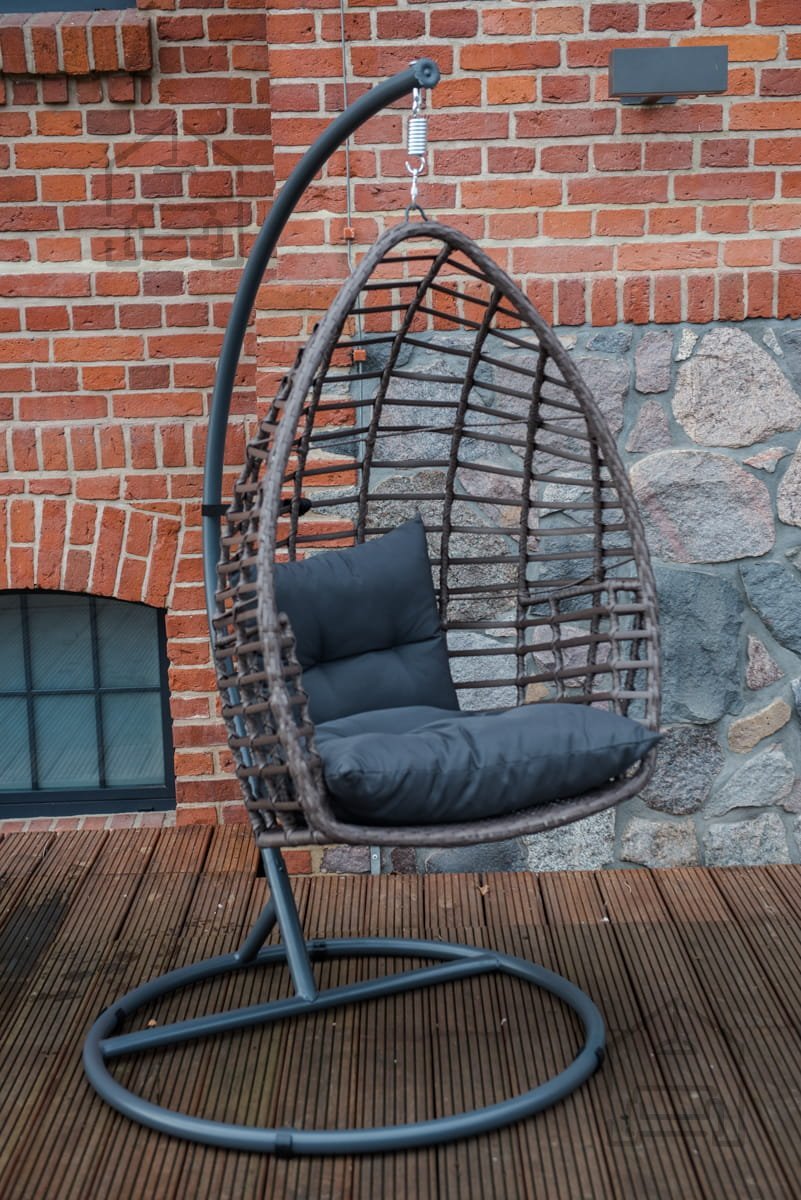 Die Gesamthöhe des Sessels beträgt 195 cm, der Durchmesser 105 cm, die Breite 83 cm und die Tiefe 65 cm. Diese Maße bieten ausreichend Platz und ein sicheres Sitzgefühl – ideal auch für Erwachsene. Die Konstruktion ermöglicht ein sanftes Schaukeln, das Verspannungen löst und ein Gefühl der Schwerelosigkeit vermittelt. Der Sessel wird an einem stabilen Trägerrohr befestigt, das ein ruhiges, sicheres Schwingen ohne Wackeln erlaubt. Das Design des Modells Piatto ist optisch ausgewogen – die runde Sitzform und der elegant geschwungene Halter sorgen für einen modernen, zugleich natürlichen Look, der jedem Außenbereich Wärme und Behaglichkeit verleiht.
