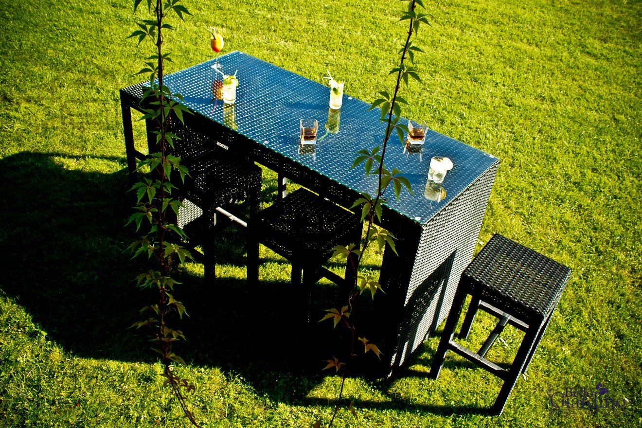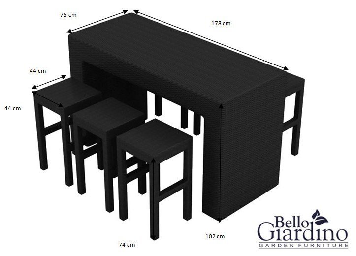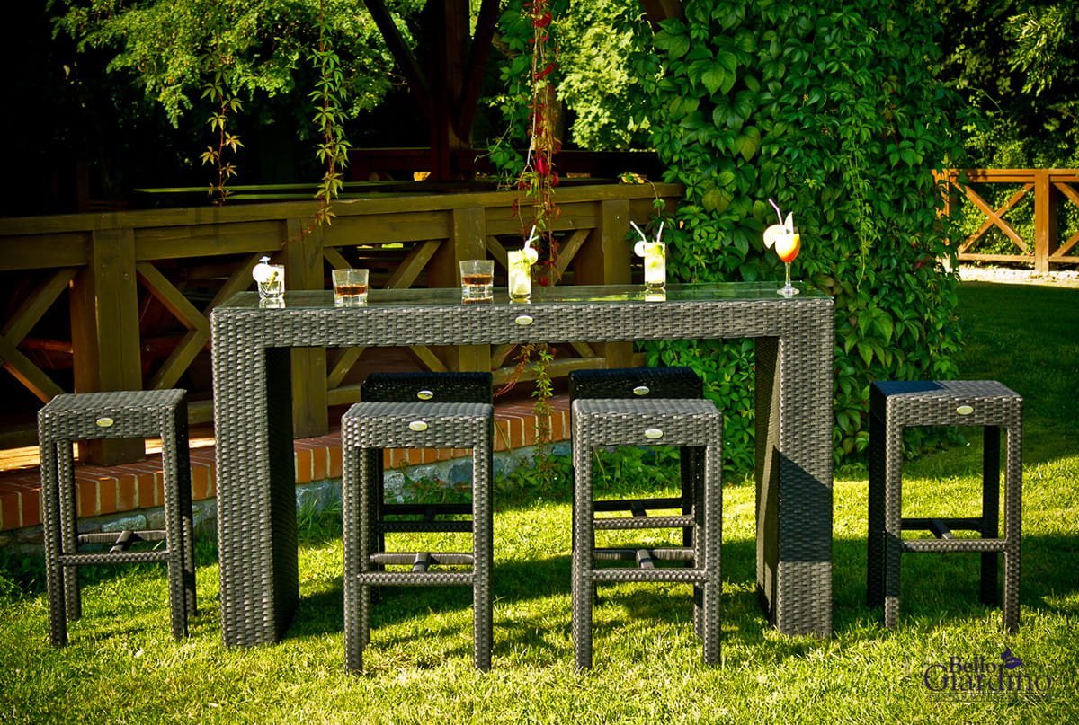 So finden bis zu sechs Personen bequem Platz, ohne dass die Garnitur zu viel Raum auf Terrasse oder Balkon einnimmt. Die erhöhte Tischhöhe macht sie außerdem vielseitig einsetzbar – etwa in Kombination mit Barhockern oder als stilvolle Einrichtung für Gastronomiebereiche wie Cafés, Hotelterrassen oder Weinbars.