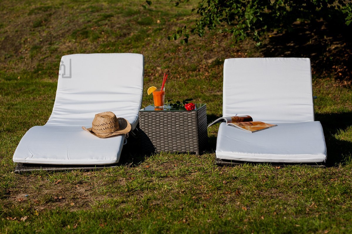Jede Liege ist mit bequemen Polstern ausgestattet, die im Preis inbegriffen sind. Die Bezüge sind abnehmbar und mit einem Reißverschluss versehen, was die Reinigung erleichtert. Sie bestehen aus wasserabweisendem 100 % Polyester – ideal für den Außenbereich und zugleich angenehm im Griff. Der praktische Tisch rundet das Set ab und bietet Platz für Getränke, Bücher oder Sonnenbrillen – ein kleines Detail, das den Komfort im Alltag deutlich erhöht.