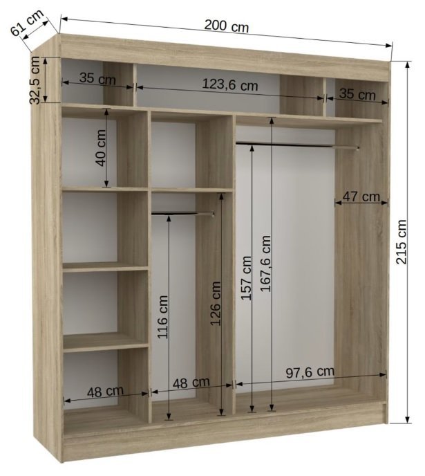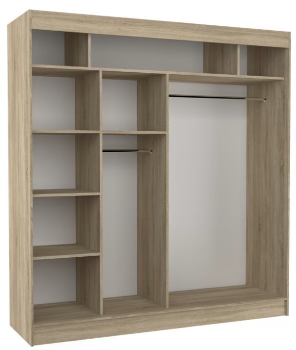 Das Innere des Schranks ist clever konzipiert, um den vorhandenen Platz optimal zu nutzen. Im oberen Bereich befinden sich zwei großzügige Fächer, ideal für saisonale Kleidung, Bettwäsche oder Boxen mit Accessoires. Auf der linken Seite bieten drei zusätzliche Einlegeböden Platz für gefaltete Kleidung, Taschen oder kleinere Gegenstände. Der mittlere und rechte Teil sind mit zwei Kleiderstangen ausgestattet, an denen Hemden, Kleider und Mäntel ordentlich und übersichtlich aufgehängt werden können.