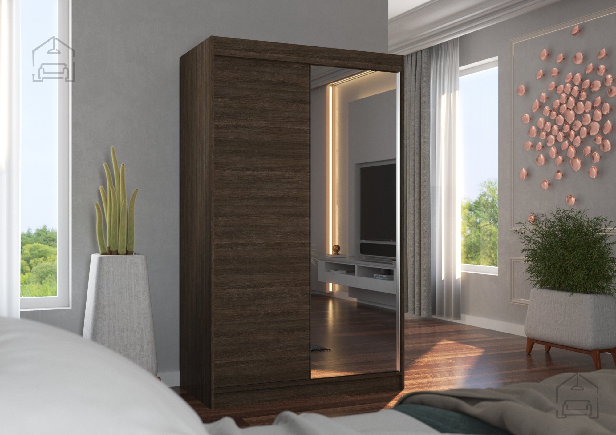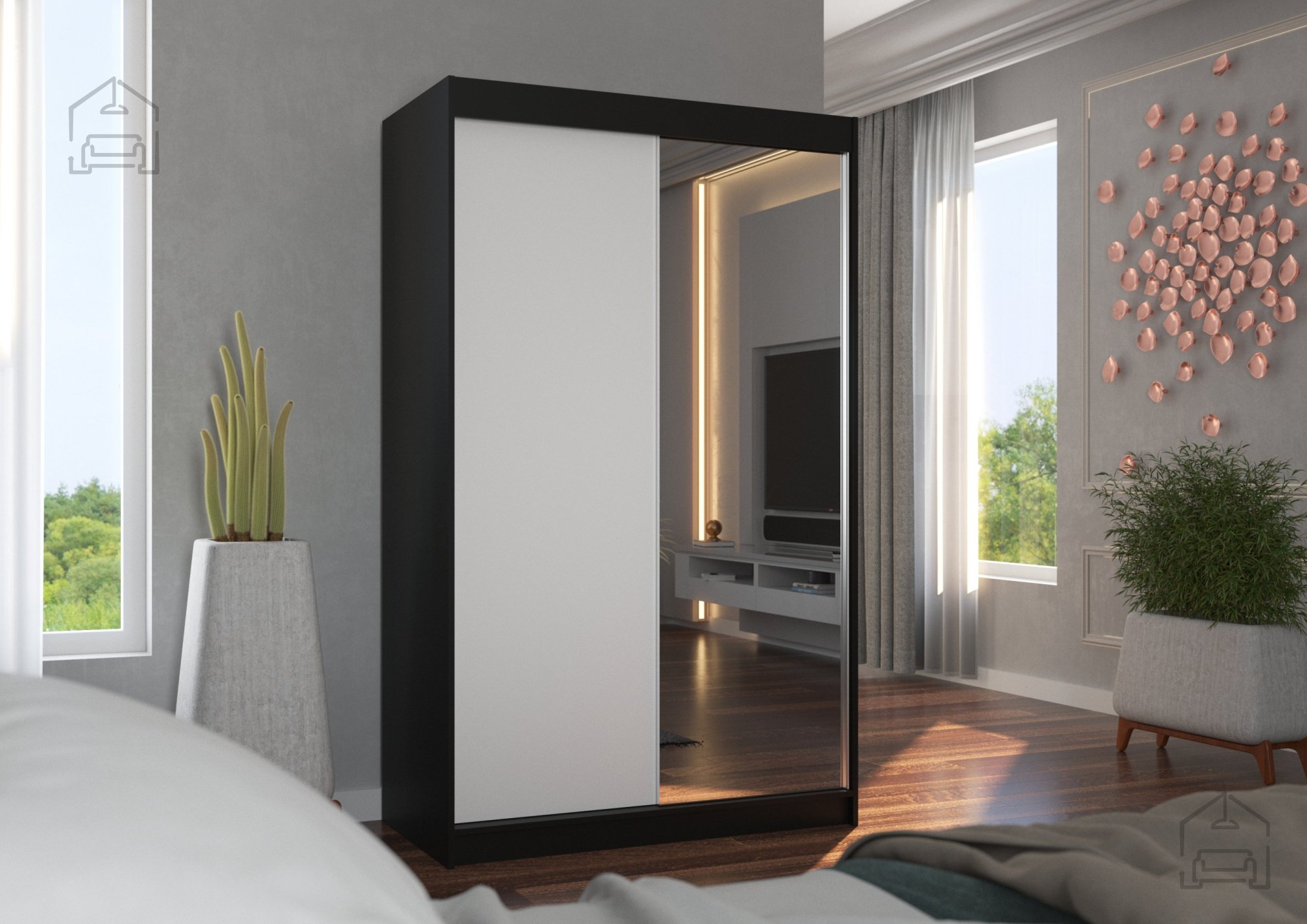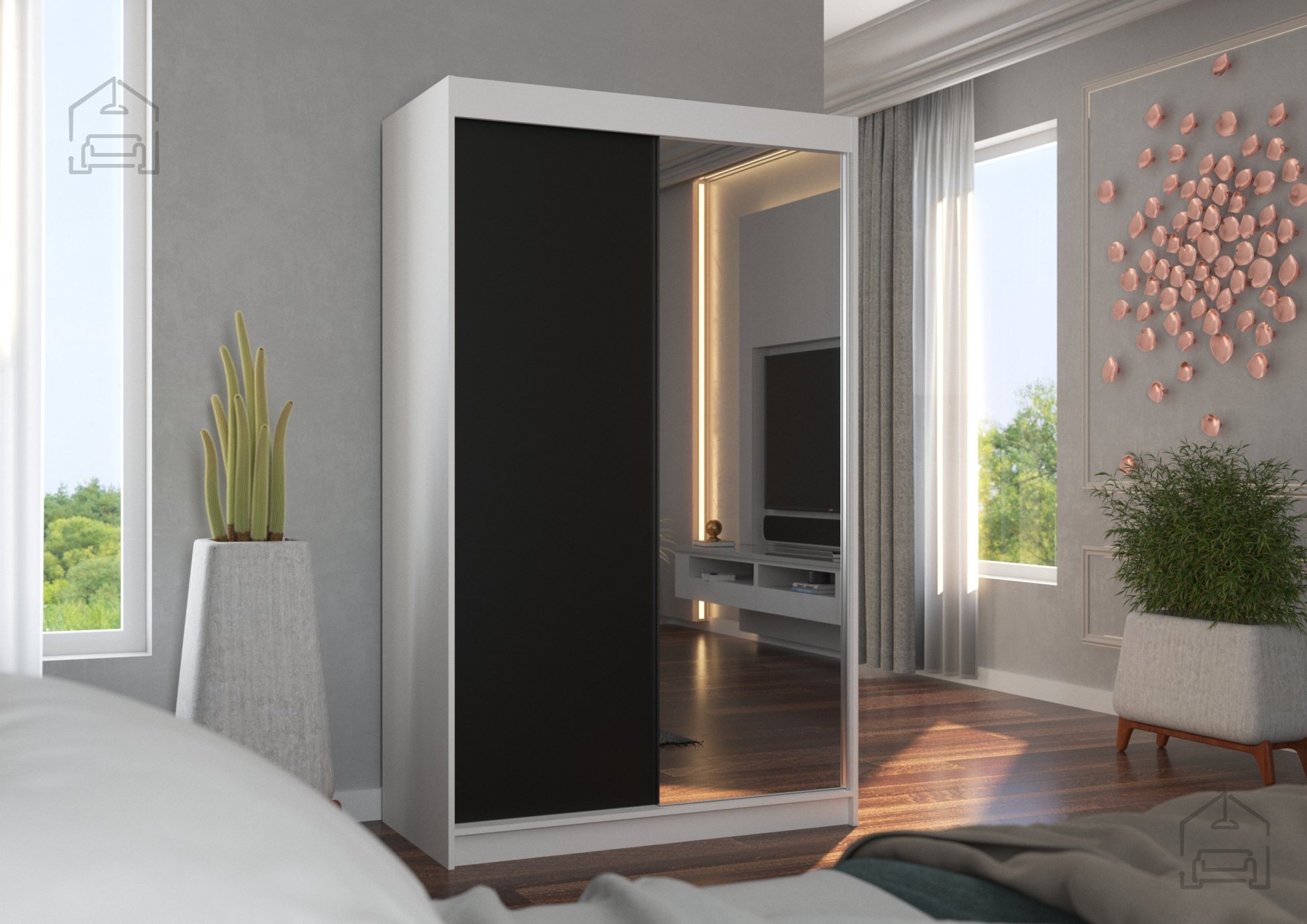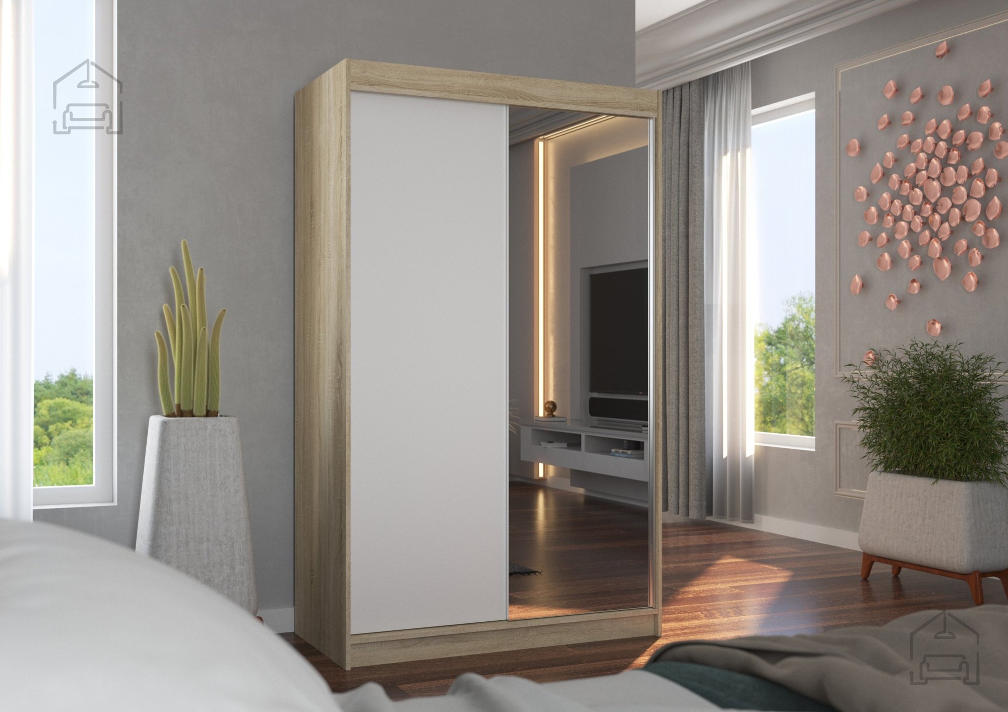 Mit den Maßen 120x58x200 cm passt der Schrank sowohl in größere als auch in kleinere Räume. Die Schiebetüren bewegen sich auf Aluminiumführungen leise und leichtgängig – besonders praktisch in kleineren Schlafzimmern oder Fluren, da sie keinen zusätzlichen Platz zum Öffnen benötigen. Der Spiegel an den Türen ist nicht nur alltagstauglich, sondern lässt den Raum auch offener und heller wirken.