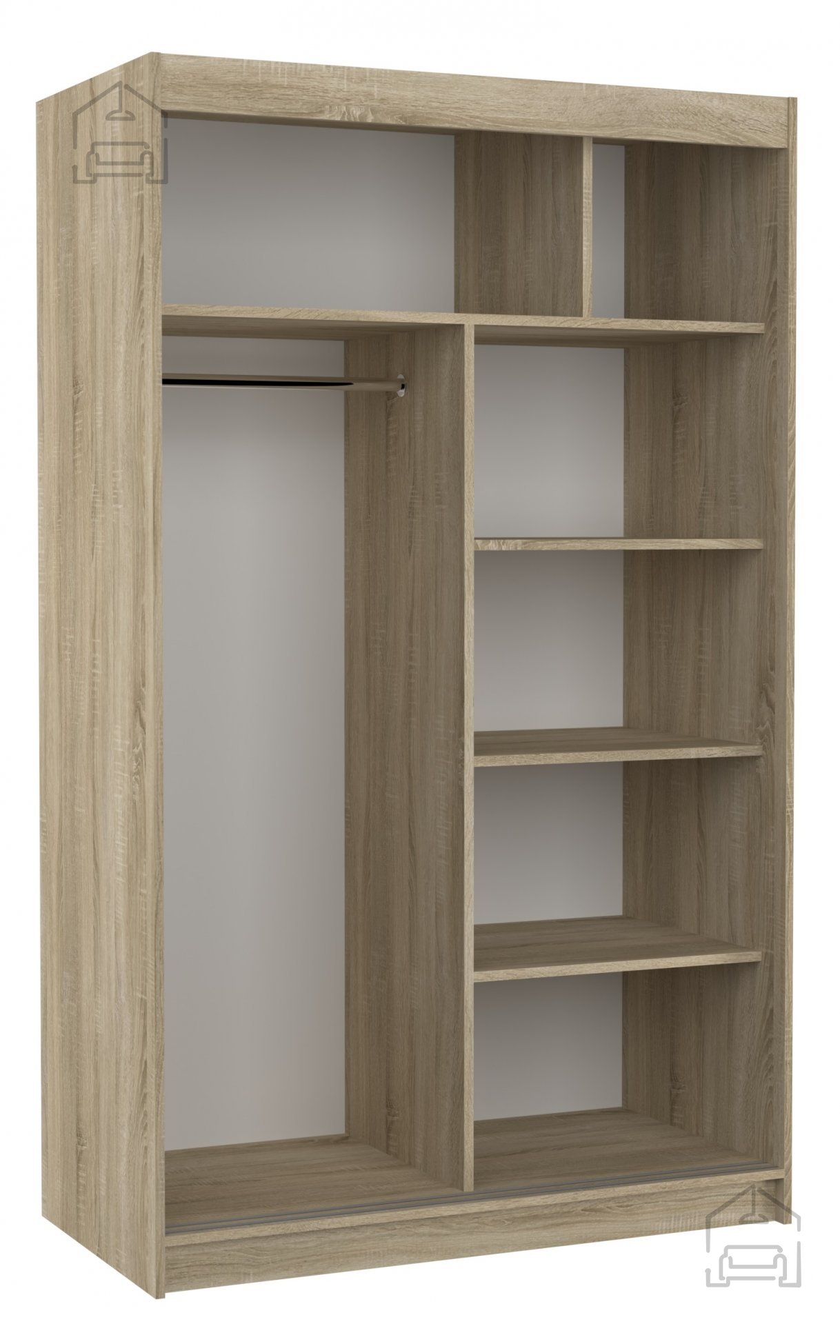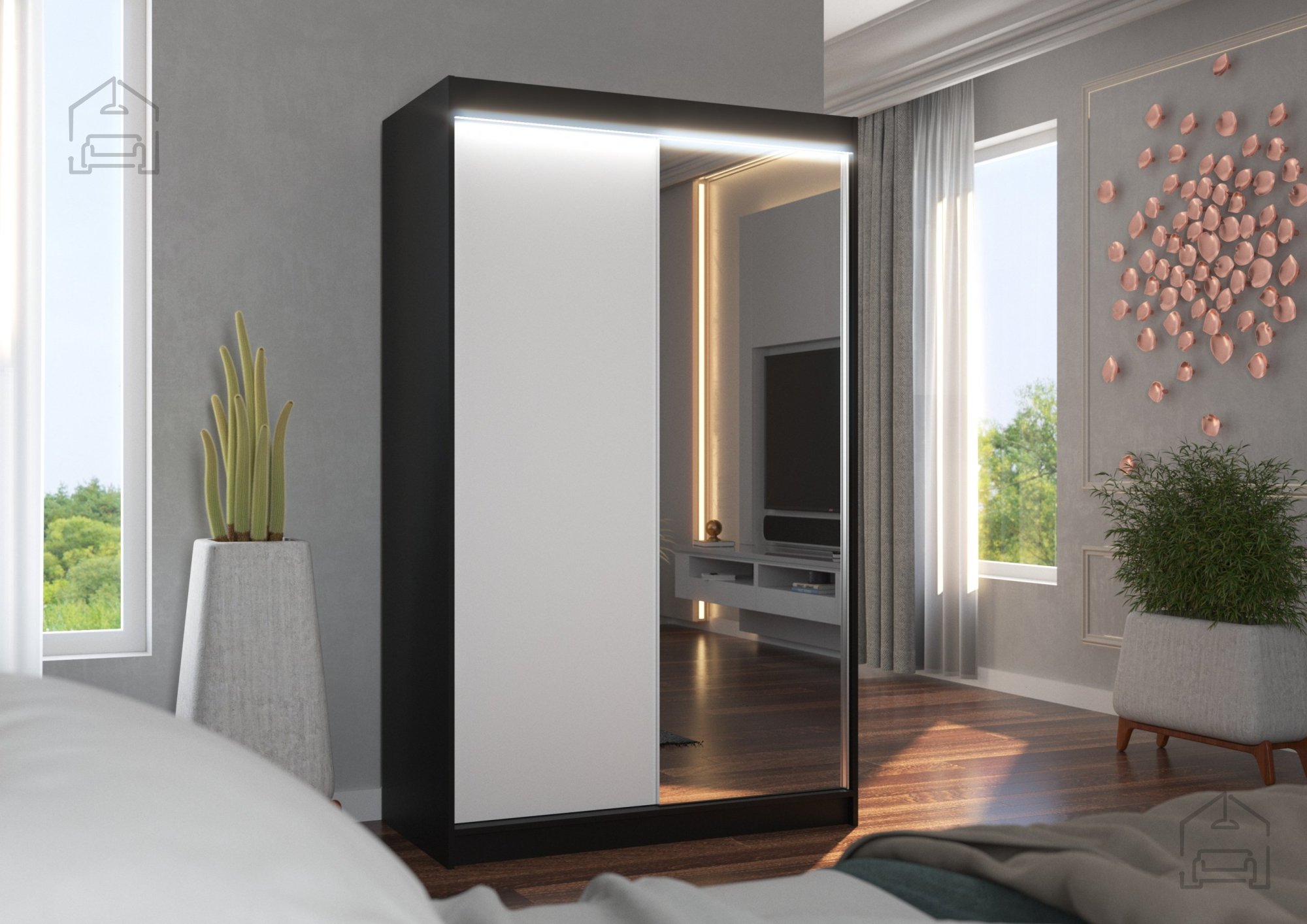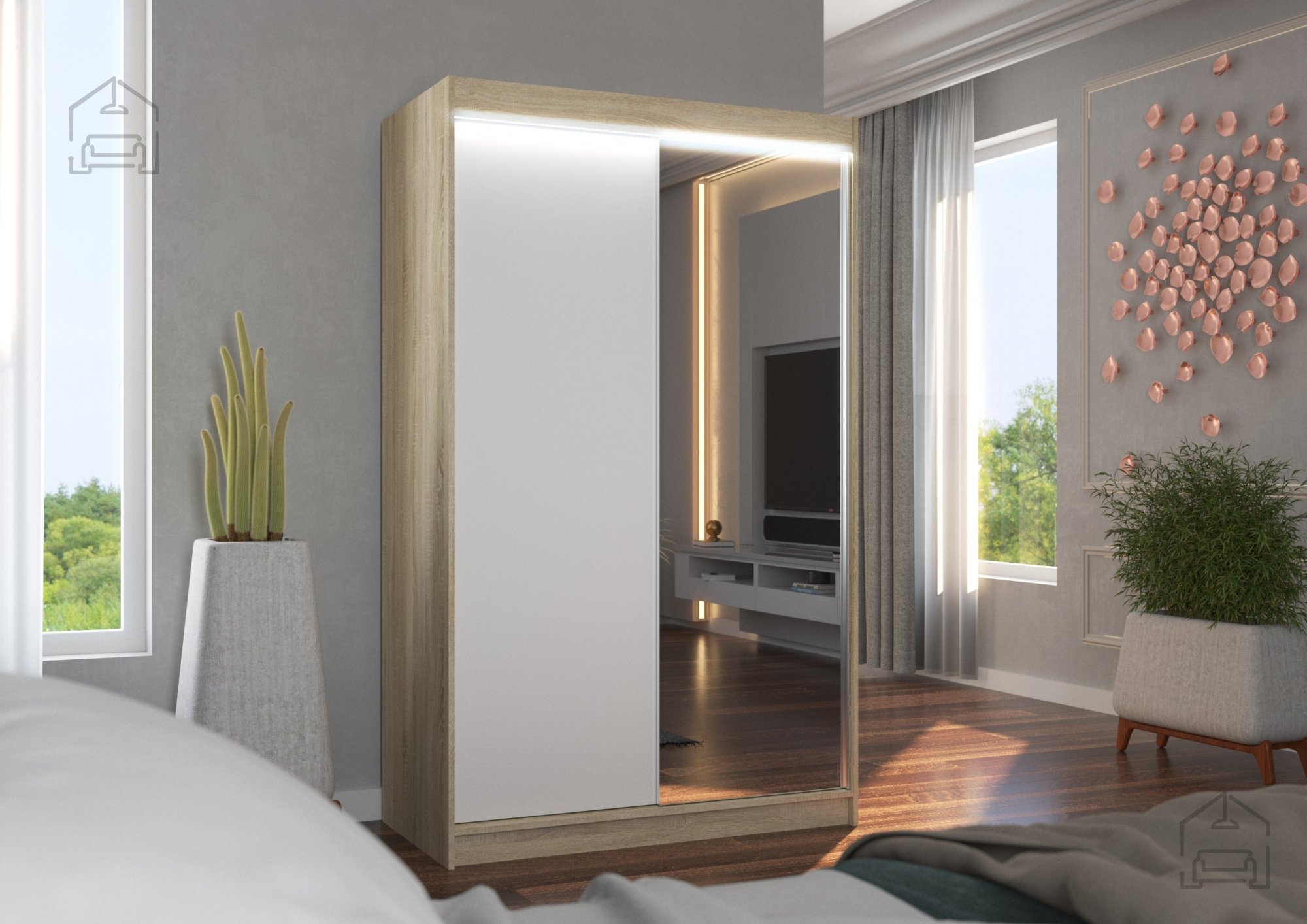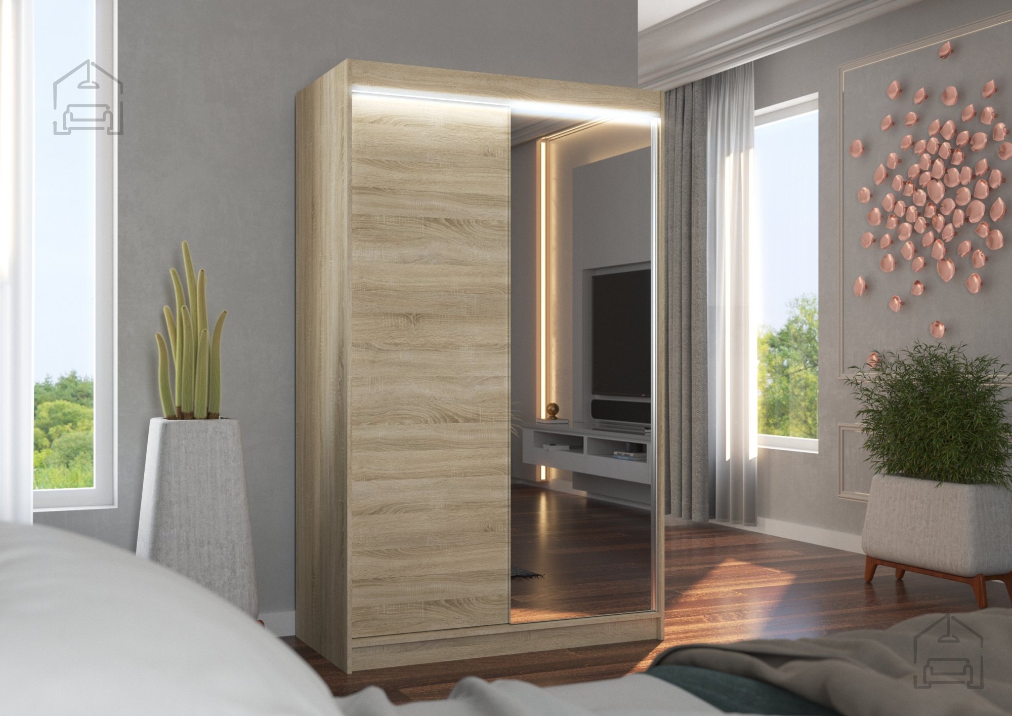Mit den Maßen 120x58x200 cm passt der Schrank sowohl in größere als auch in kleinere Räume. Die Schiebetüren bewegen sich auf Aluminiumführungen leise und leichtgängig – besonders praktisch in kleineren Schlafzimmern oder Fluren, da sie keinen zusätzlichen Platz zum Öffnen benötigen. Der Spiegel an den Türen ist nicht nur alltagstauglich, sondern lässt den Raum auch offener und heller wirken.