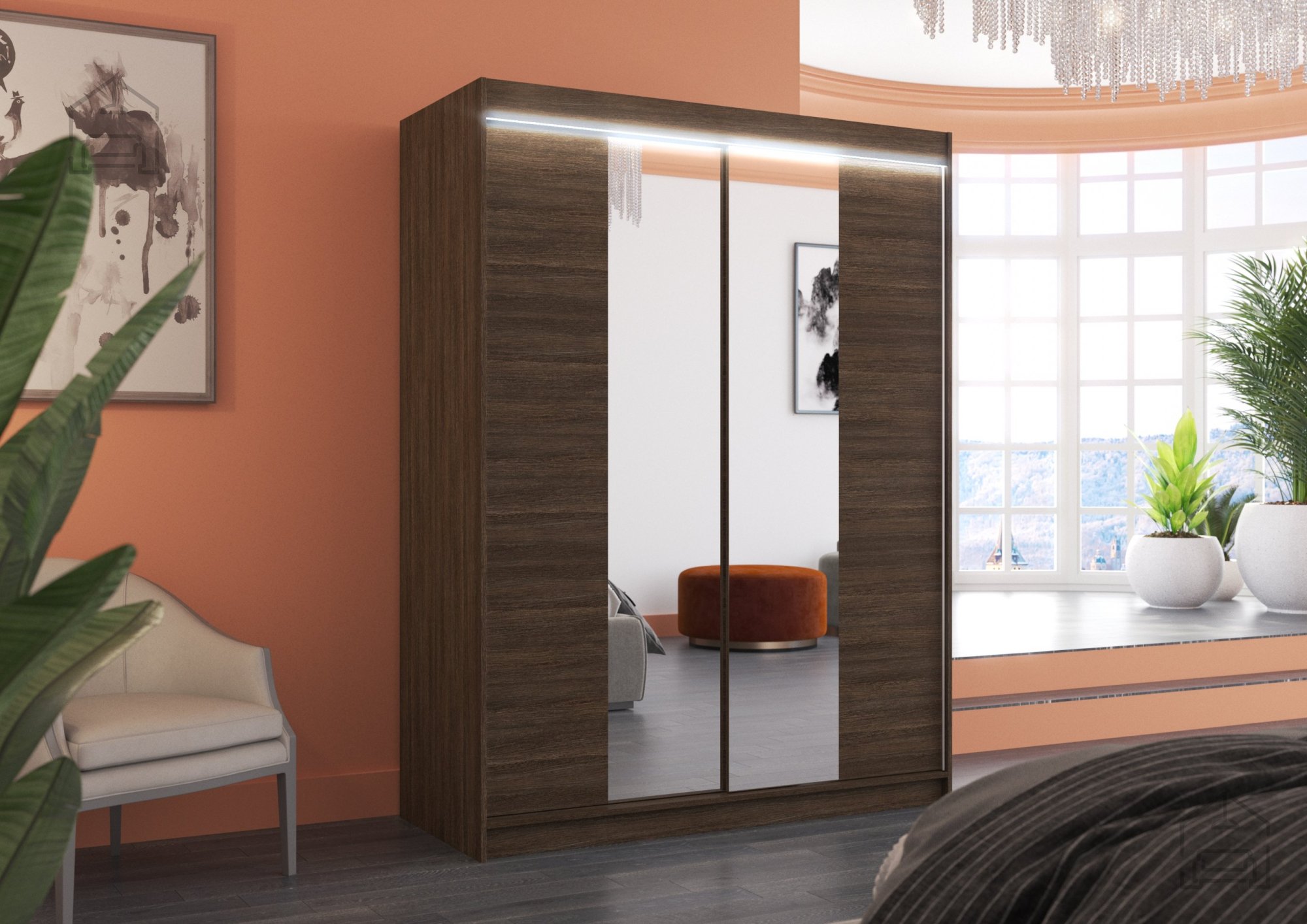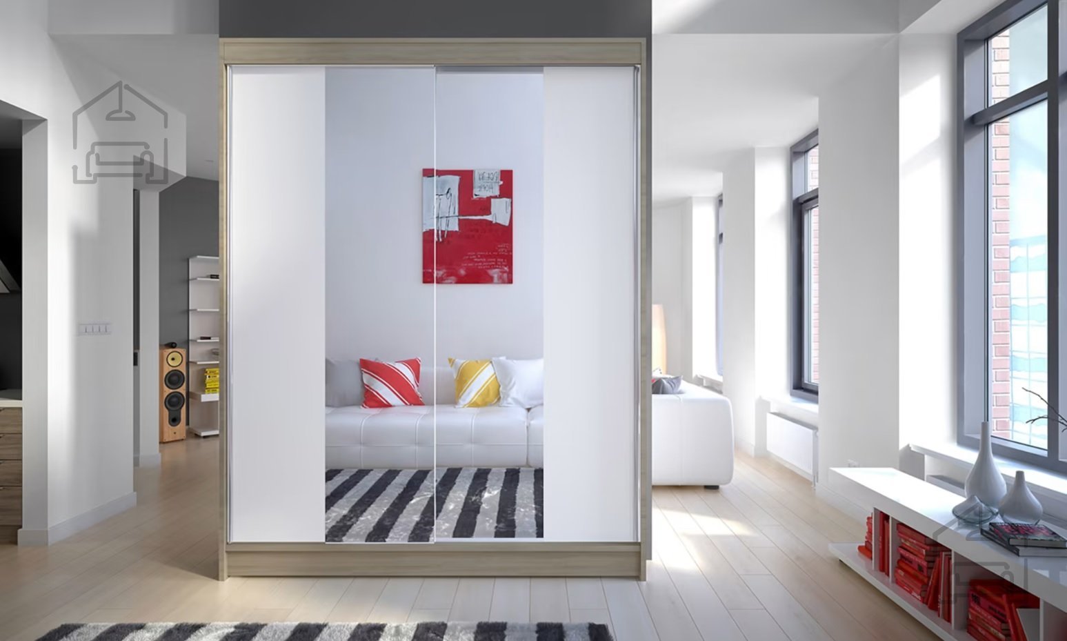 Der Schrank besteht aus hochwertigem Span- und MDF-Platten, was Stabilität und eine lange Lebensdauer garantiert. Er ist in mehreren Farbkombinationen erhältlich – Schwarz, Weiß und Sonoma-Eiche für den Korpus sowie Schokolade, Weiß, Schwarz oder Sonoma-Eiche für die Fronten. Der Spiegel auf der Tür lässt den Raum optisch größer wirken und schafft ein Gefühl von Weite – besonders praktisch in kleineren Schlafzimmern oder Vorzimmern. Die Schiebetüren ermöglichen ein leichtes Öffnen und Schließen, ohne zusätzlichen Platz zu beanspruchen, was den Schrank auch für schmale Räume ideal macht.