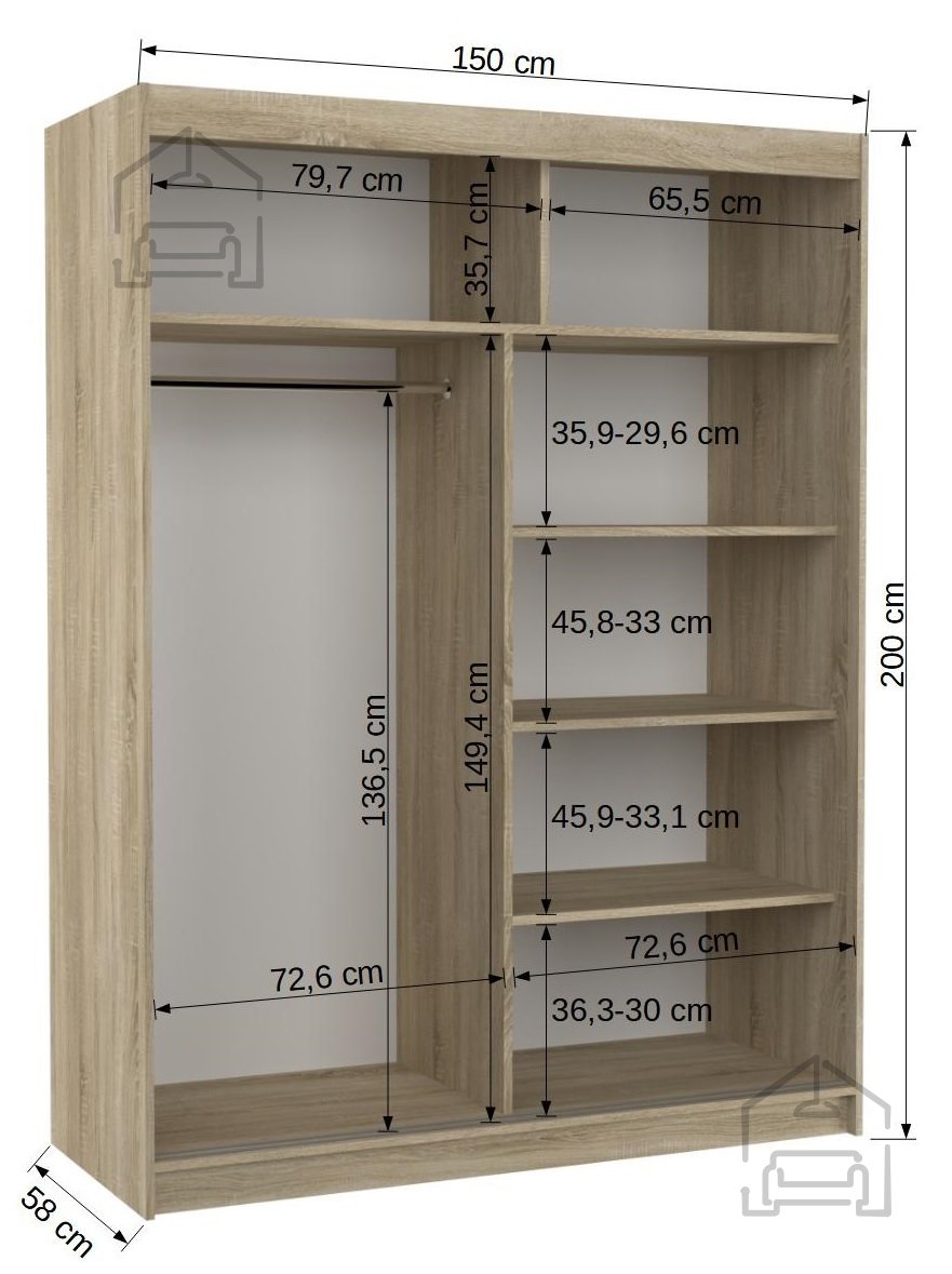Wenn Sie auf der Suche nach einer perfekten Kombination aus modernem Design, Funktionalität und Qualität sind, ist dieser Kleiderschrank mit Schiebetüren die ideale Lösung für Ihr Zuhause. Mit seinen Maßen von 150x58x200 cm passt er hervorragend in größere wie auch kleinere Räume und bietet dabei jede Menge Stauraum für Kleidung, Schuhe und Accessoires. Das elegante Erscheinungsbild und die Auswahl an verschiedenen Farbvarianten – von klassischem Weiß oder Schwarz bis hin zu warmem Sonoma-Eichen- oder Schokoladeton – machen es leicht, den Schrank harmonisch mit dem übrigen Mobiliar in Schlafzimmer, Vorraum oder Ankleide abzustimmen.