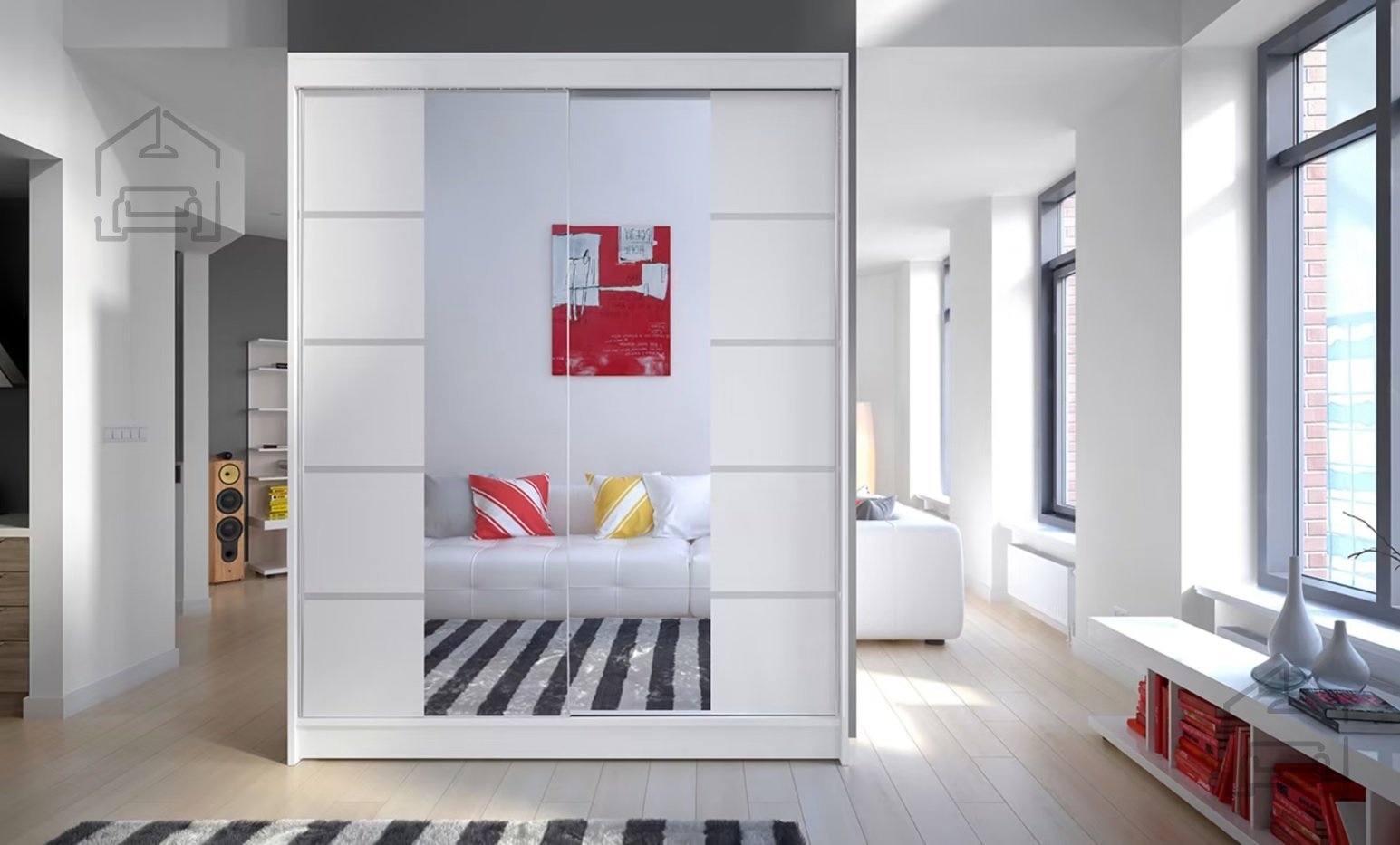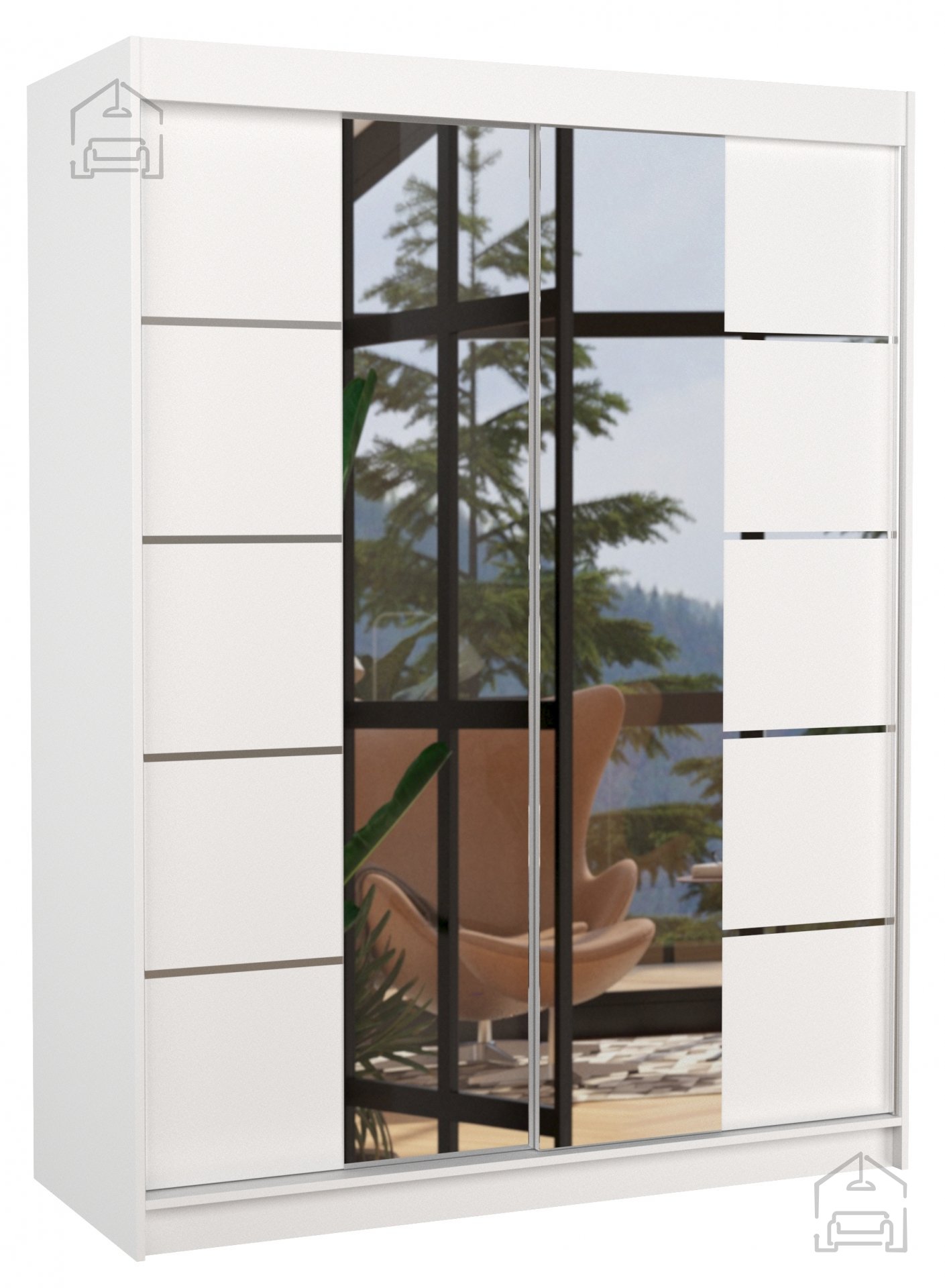 Der Schrank ist aus hochwertigem Spanplattenmaterial und MDF-Platten gefertigt, was für Langlebigkeit und Stabilität sorgt. Details wie die klare weiße Farbe der Fronten und die eleganten horizontalen Linien verleihen dem Möbelstück ein modernes Erscheinungsbild, das sich sowohl im Schlafzimmer als auch im Jugendzimmer oder Vorraum hervorragend macht. Auf der Vorderseite befindet sich ein großes Spiegel, das den Alltag erleichtert, den Raum optisch vergrößert und für mehr Helligkeit und Leichtigkeit sorgt.