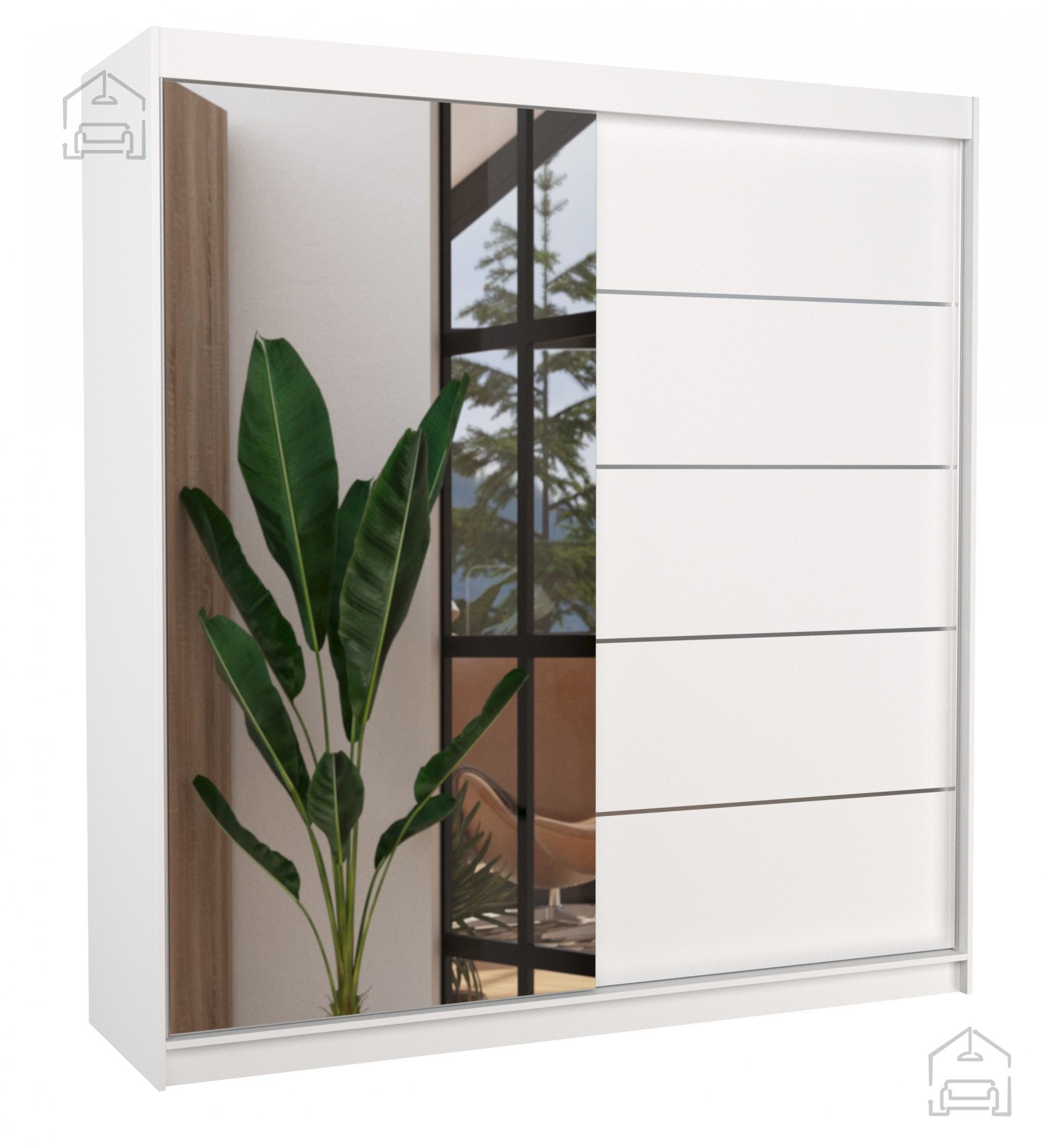 Mit den Maßen von 200x58x215 cm bietet der Schrank reichlich Platz, um Kleidung, Schuhe und Accessoires ordentlich zu verstauen. Die Schiebetüren sind äußerst praktisch, da sie beim Öffnen keinen zusätzlichen Raum beanspruchen – besonders vorteilhaft in kleineren Wohnungen oder Zimmern, wo jeder Zentimeter zählt. Im Inneren finden Sie eine durchdachte Kombination aus Regalböden und Kleiderstange, die eine übersichtliche Organisation ermöglicht.