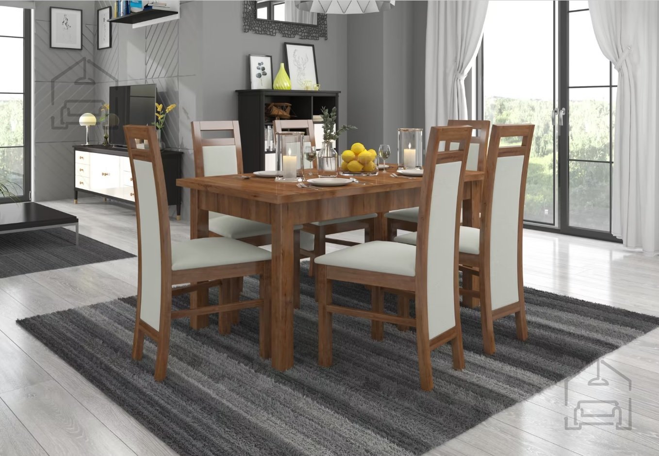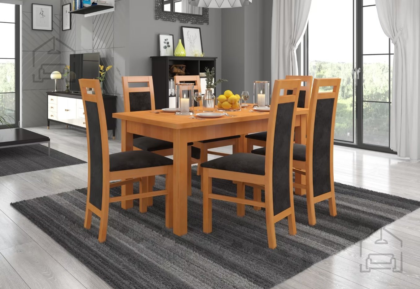 Gefertigt wird es in der renommierten Fabrik ADRK in Polen, wo Qualität und präzise Verarbeitung bis ins kleinste Detail spürbar sind. Zum Einsatz kommt ein robuster MDF-Rahmen in Kombination mit massivem Buchenholz, was dem Set Stabilität, Langlebigkeit und eine solide Konstruktion verleiht. Der Esstisch ist ausziehbar, sodass Sie ihn je nach Anzahl der Gäste mühelos anpassen können – perfekt für Familienessen, Feiern oder gemütliche Abende mit Freunden.
