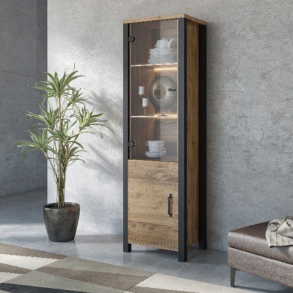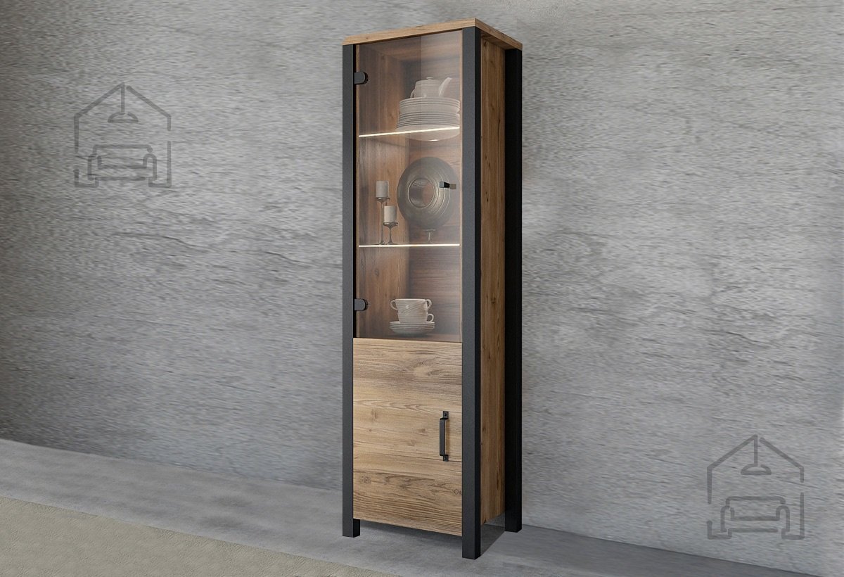 1. Modernes Industriedesign: Die Vitrine Olin Klein bringt den Charme des modernen Industriestils in Ihr Zuhause. Die Kombination aus Fichtenoptik und mattschwarzen Elementen mit Metallgriffen erinnert an rohe Metallakzente und verleiht dem Möbelstück einen unverwechselbaren Charakter, der jeden Besucher begeistern wird.