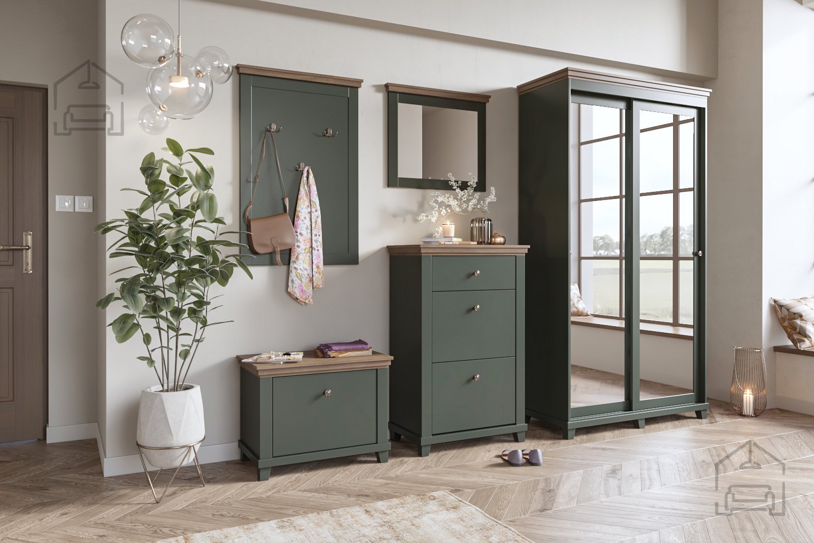 Entdecken Sie die zeitlose Eleganz und außergewöhnliche Funktionalität unserer Kollektion Wohnzimmer und Flur Evora. Das edle Design kombiniert den dunkelgrünen Korpus mit den warmen Fronten in Ribbec-Eiche und schafft so ein harmonisches Gleichgewicht zwischen modernem und klassischem Stil. Diese Kollektion ist ideal für alle, die ihrem Zuhause einen Hauch von Raffinesse und Gemütlichkeit verleihen möchten.