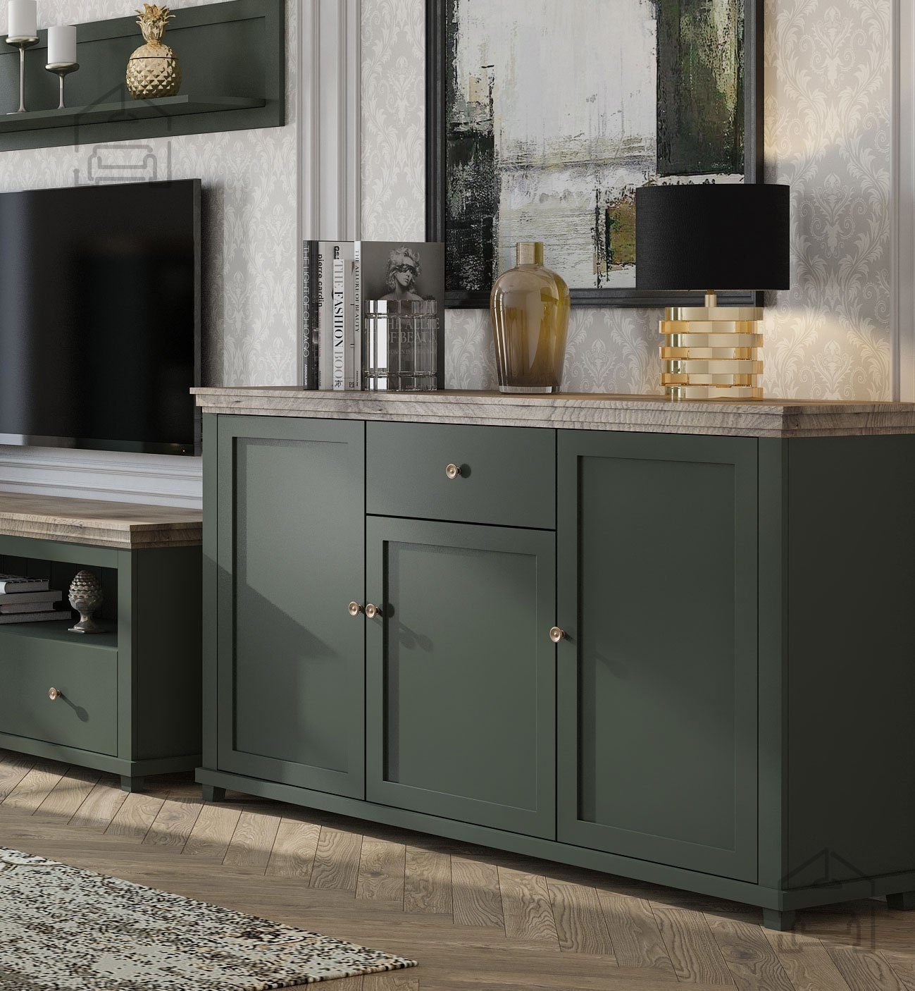 Entdecken Sie die perfekte Balance zwischen Stil und Alltagstauglichkeit mit unserer Kommode 3 Evora – grün – 24ZRJU47. Dieses außergewöhnliche Möbelstück aus hochwertigem MDF bringt einen Hauch von zeitloser Eleganz in Ihr Zuhause. Mit den Maßen 160x42x93,3 cm bietet sie reichlich Stauraum und verleiht jedem Raum durch ihr ansprechendes Design ein harmonisches Ambiente.