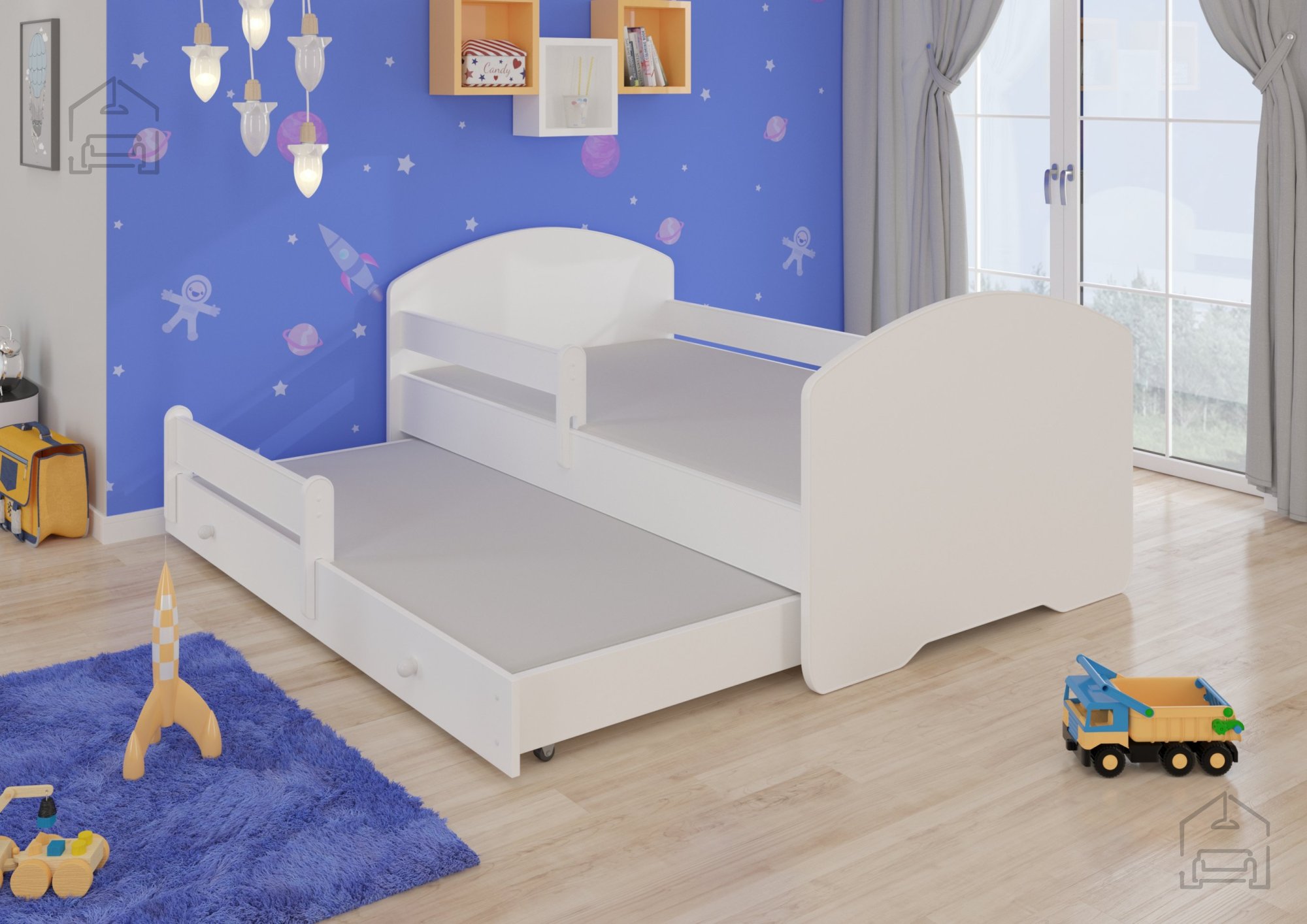 Das Bett kombiniert einen schlichten Look in klassischem Weiß mit hoher Alltagstauglichkeit. Sein größter Vorteil ist das zusätzliche Ausziehbett, das sich mühelos herausziehen lässt – ideal für Gäste oder Geschwister. So ist das Kinderzimmer jederzeit bereit für Übernachtungsbesuch. Die obere Liegefläche misst 80x160 cm, die untere 80x145 cm – genug Platz also für einen bequemen und ruhigen Schlaf.