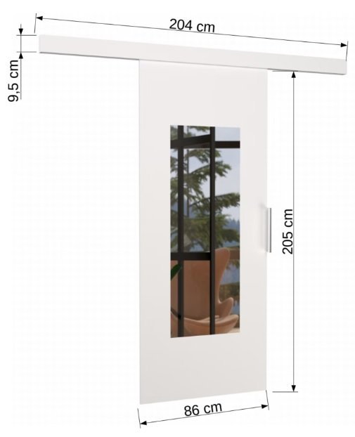 Die Tür misst 86x0x205 cm, der Rahmen hat die Maße 204x9,5 cm – perfekt passend für die meisten Standardöffnungen. Dank der universellen Konstruktion kann die Tür sowohl links- als auch rechtsseitig montiert werden, was maximale Flexibilität bei der Raumgestaltung bietet. Das Modell Nela 86 ist mit einem stabilen Aluminiumgriff sowie hochwertigen Laufschienen ausgestattet, die bereits im Set enthalten sind – zusätzliche Käufe oder spezielle Anpassungen sind daher nicht erforderlich.