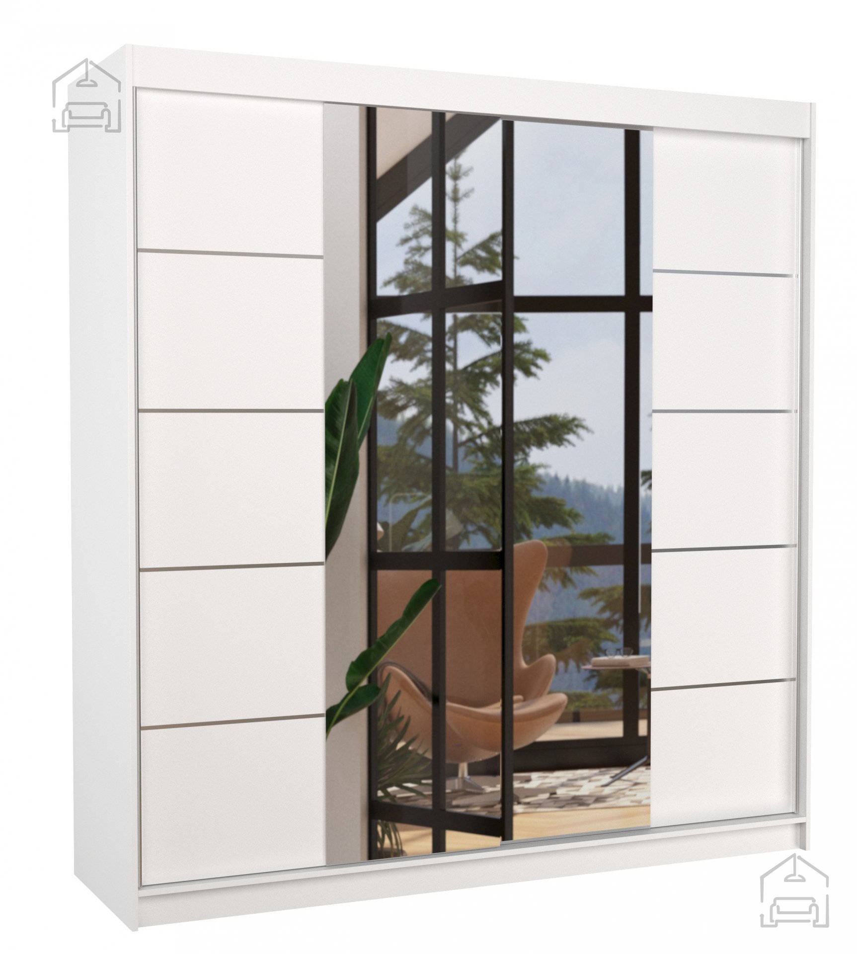 Das minimalistische Weiß des Schranks passt wunderbar zu unterschiedlichen Einrichtungsstilen – vom modernen skandinavischen Look bis hin zu klassisch-eleganten Räumen. Auf der Vorderseite befindet sich ein großer Spiegel, der dem Raum mehr Helligkeit und Weite verleiht. Dezente silberne Linien sorgen für eine feine, elegante Note und machen den Schrank zum stilvollen Blickfang Ihres Schlafzimmers.