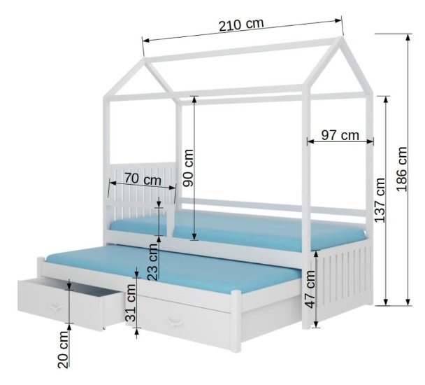 Die Gesamtmaße des Bettes betragen 97x208x186 cm, wodurch es sich bequem nutzen und gut in den meisten Kinderzimmern platzieren lässt. Die Liegefläche misst 90x200 cm – die Standardgröße für ein Einzelbett. Das untere Zusatzbett eignet sich hervorragend für Gäste oder Geschwister und kann nach Gebrauch einfach unter das Hauptbett geschoben werden. Der mitgelieferte Lattenrost sorgt für gute Belüftung der Matratze und verlängert deren Lebensdauer.