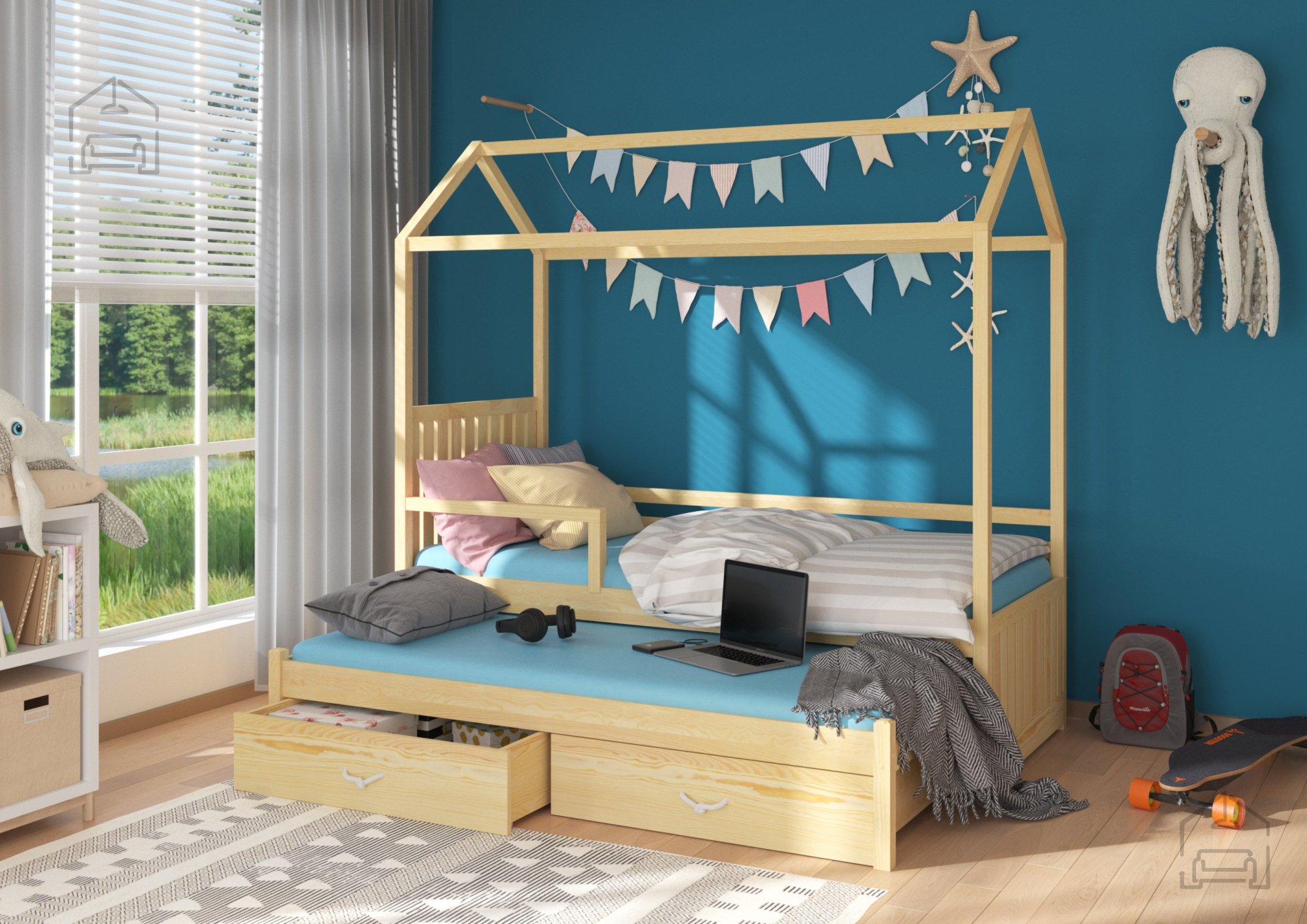 Jonaszek ist mehr als nur ein Bett – es ist ein clever gestaltetes Möbelstück, das den vorhandenen Raum optimal nutzt. Die integrierte Schublade bietet reichlich Platz für Decken, Pölster oder Spielzeug und hilft, das Zimmer ordentlich zu halten. Das Zusatzbett ist mit Rollen ausgestattet, sodass es sich mühelos herausziehen lässt – ideal für Kinder oder Eltern, die es bequem handhaben möchten. Der Rausfallschutz am oberen Bett sorgt für zusätzliche Sicherheit während des Schlafs und verhindert unbeabsichtigte Stürze – besonders praktisch für jüngere Kinder, die sich im Schlaf viel bewegen.
