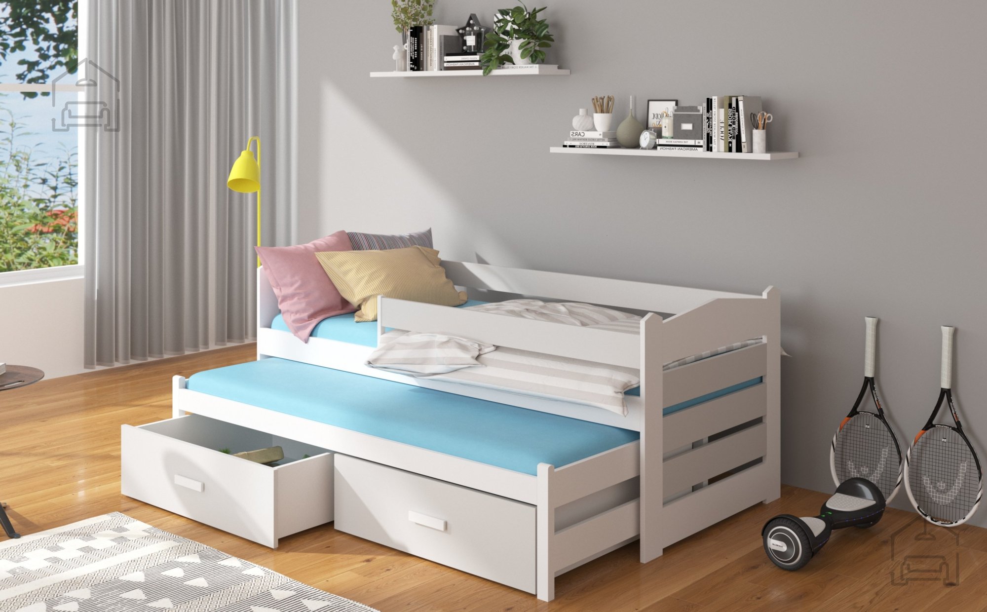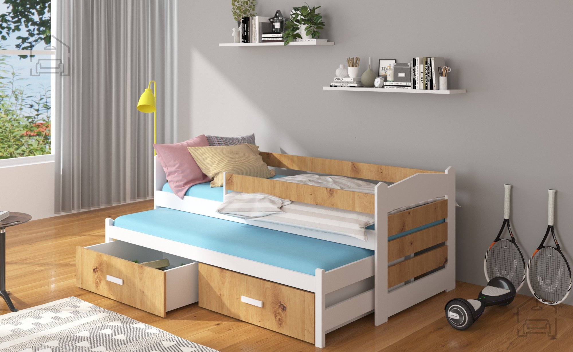 Ein besonderes Highlight des Modells Tiarro sind die zwei geräumigen Schubladen unter der Liegefläche. Sie eignen sich ideal zur Aufbewahrung von Bettwäsche, Spielzeug oder saisonaler Kleidung und helfen, Ordnung im Zimmer zu halten. Das Auszugssystem ermöglicht eine einfache Handhabung – auch für Kinder –, da die Schubladen leichtgängig auf Schienen laufen. Dieses praktische Detail macht das Bett noch funktionaler und unterstützt eine bessere Organisation im Alltag.