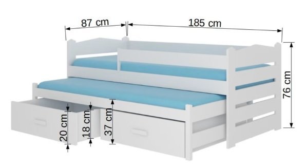 Das Bett Tiarro wird aus massivem Kiefernholz gefertigt, das für seine Robustheit und warme Optik bekannt ist. Die Holzkonstruktion ist sorgfältig verarbeitet, alle Kanten sind abgerundet – ein Pluspunkt für die Sicherheit der Kinder. Das Sicherheitsgitter ist ein unverzichtbarer Bestandteil des Bettes: Es dient als schützendes Element, das das Kind während des Schlafs sicher hält, und vermittelt zugleich Geborgenheit. Dank der gut abgestimmten Höhe kann das Kind trotz Schutz leicht ins Bett steigen oder herausklettern.