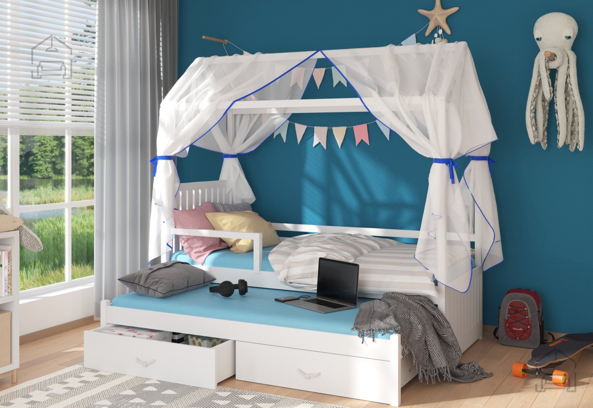 In Kinder- oder Jugendzimmern sind Geborgenheit und Komfort besonders wichtig. Der Betthimmel ADRK in Weiß mit Stoff in zarten Blau- oder Rosatönen bietet genau das – ein weiches Versteck, das den Raum in eine warme, gemütliche und spielerische Umgebung verwandelt. Er ist nicht nur ein dekoratives Element, sondern auch ein funktionales Accessoire, das für ein Gefühl von Intimität sorgt, vor lästigen Insekten schützt und die Fantasie der Kinder anregt. Das Produkt stammt aus Polen, wo der Hersteller ADRK hochwertige Materialien mit sorgfältiger Verarbeitung kombiniert – ideal für den täglichen Einsatz im Familienalltag.
