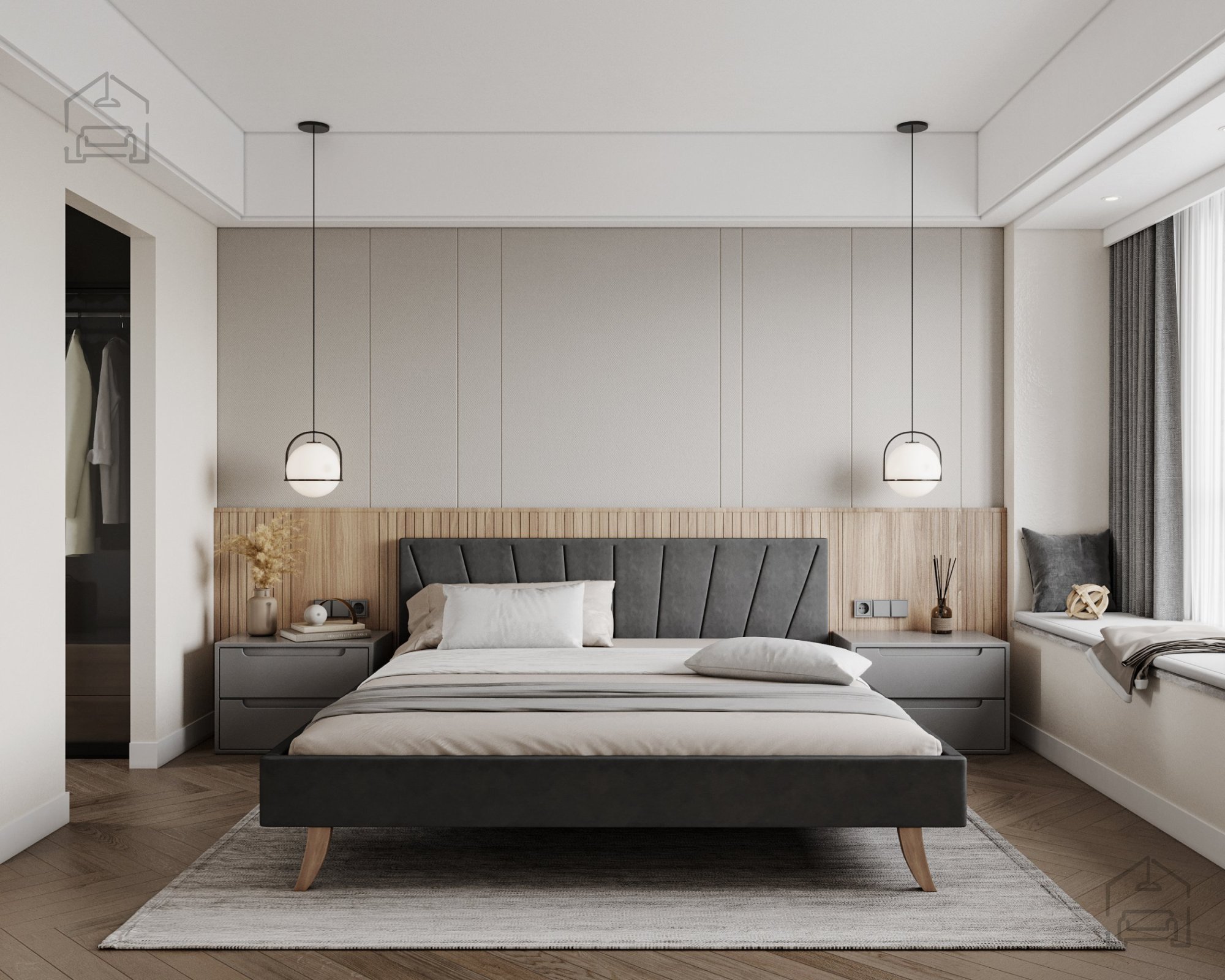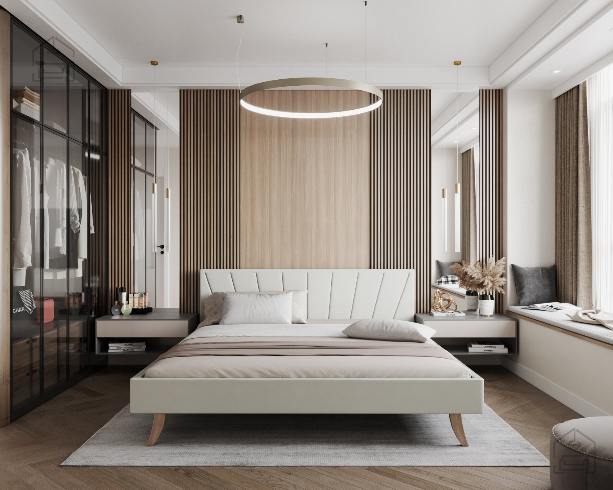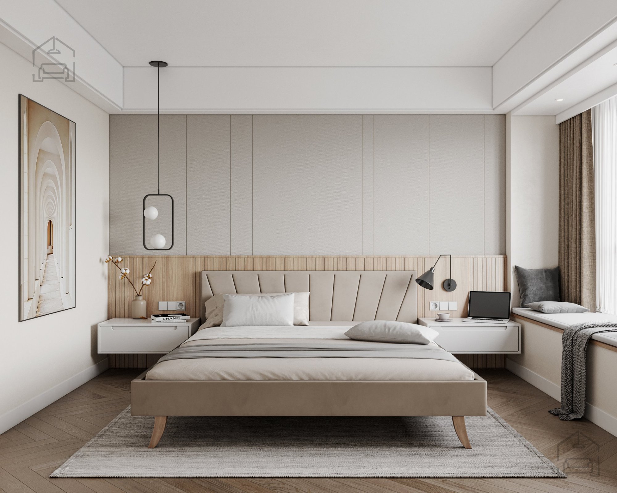 Der gepolsterte Bettrahmen verleiht ein Gefühl von Wärme und Eleganz. Durch die weiche Oberfläche ist die Berührung angenehm, während die gesteppten Details am Kopf- und Vorderteil eine subtile Dynamik im Raum schaffen. Das horizontal gesteppte Kopfteil ist speziell für bequemes Anlehnen beim Lesen oder Fernsehen gestaltet, da es eine weiche Unterstützung für Rücken und Nacken bietet.