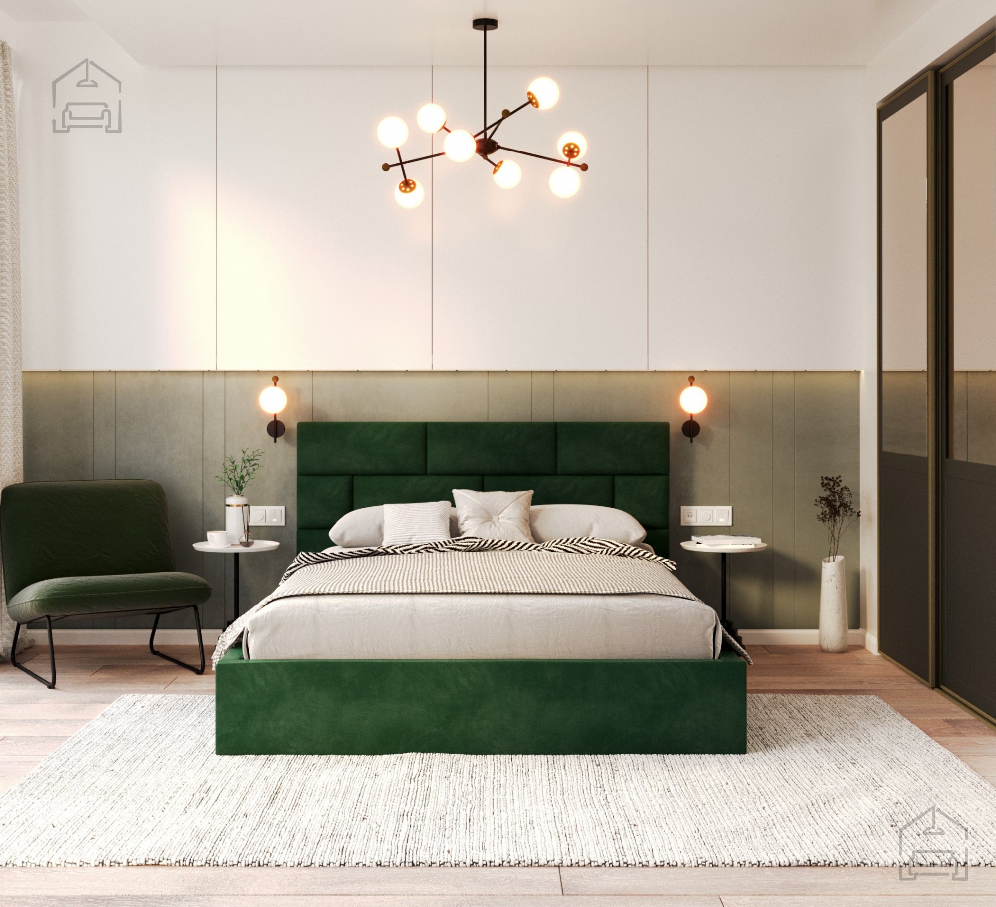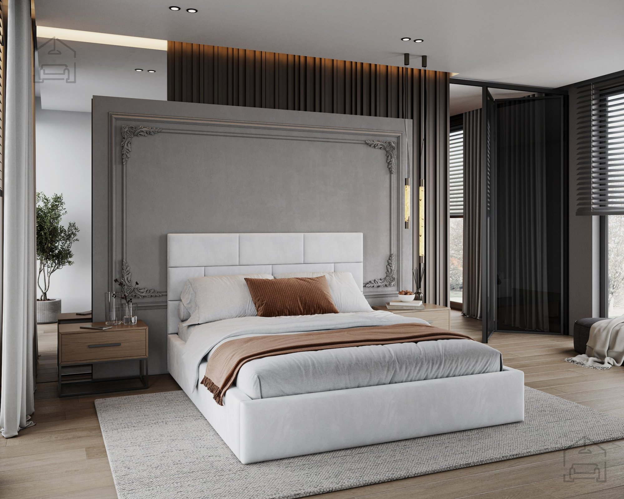 Das Kopfteil und der vordere Bettrahmen sind mit horizontalen Steppnähten versehen, was dem Bett ein elegantes, modernes Erscheinungsbild verleiht. Der gepolsterte Rahmen ist in verschiedenen Farben und Stoffen erhältlich und lässt sich harmonisch an unterschiedliche Einrichtungsstile anpassen – von minimalistisch bis klassisch. Unabhängig von der Farbwahl unterstreicht das horizontale Steppmuster die Form und verleiht dem Bett einen markanten Charakter.