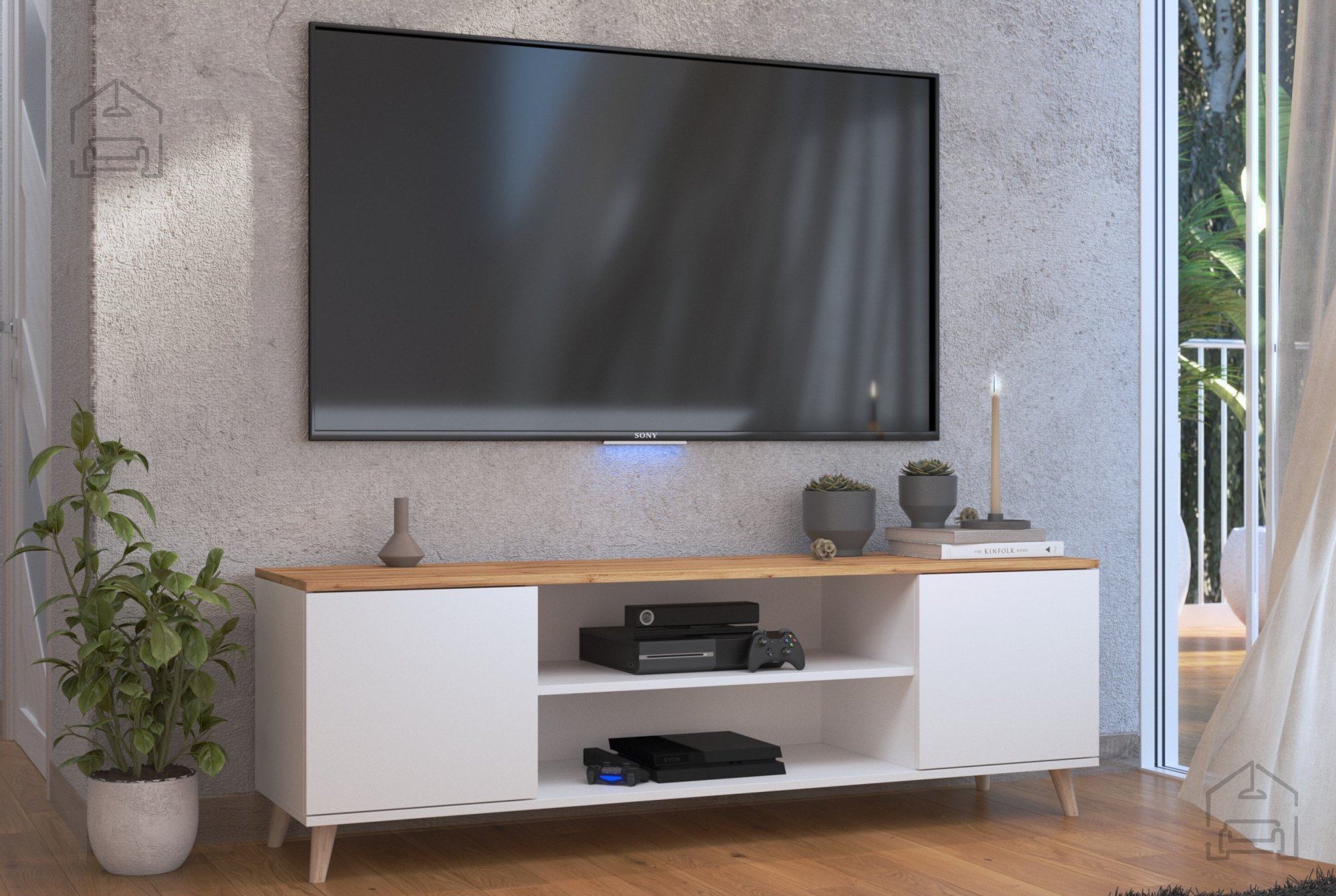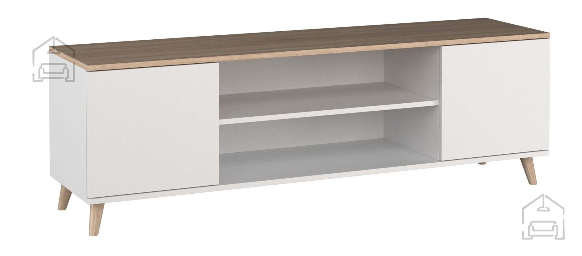 Die TV-Kommode Petra verfügt über zwei Türen, hinter denen sich praktischer Stauraum verbirgt. Im Inneren befinden sich – je nach Modellvariante – Regalböden, die eine geordnete Aufbewahrung von Kabeln, Geräten, Büchern oder Dekoartikeln ermöglichen. Die Türen lassen sich leicht und leise öffnen, was für angenehme Handhabung sorgt. Die obere Ablagefläche bietet ausreichend Platz für einen größeren Fernseher sowie für Dekoelemente wie Bilderrahmen, Pflanzen oder kleine Lampen.