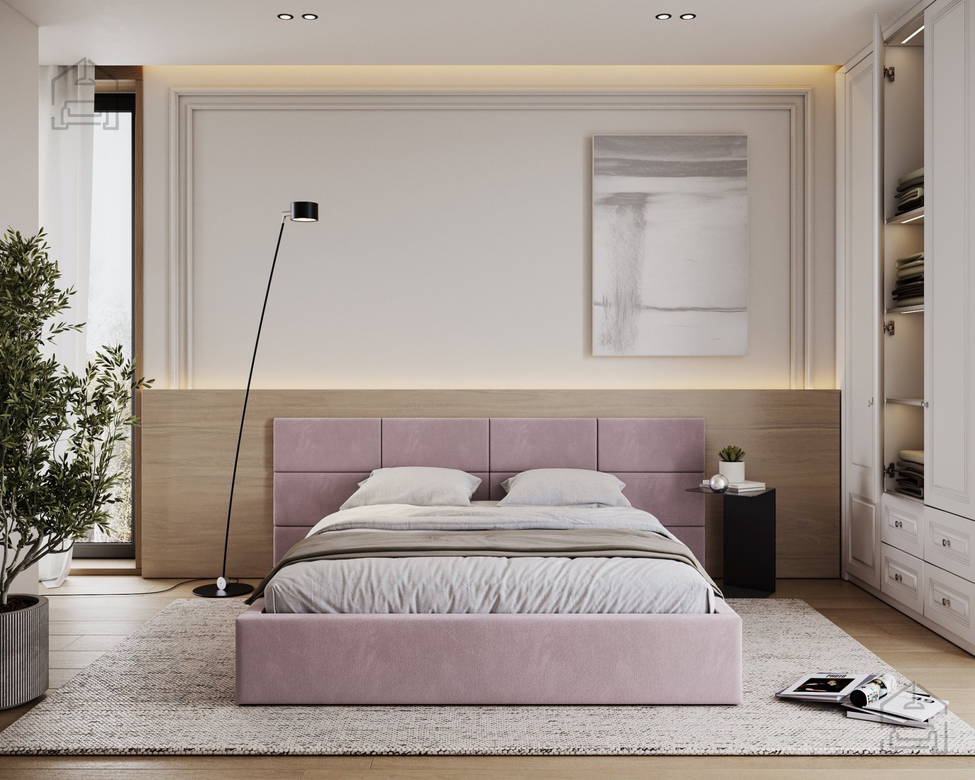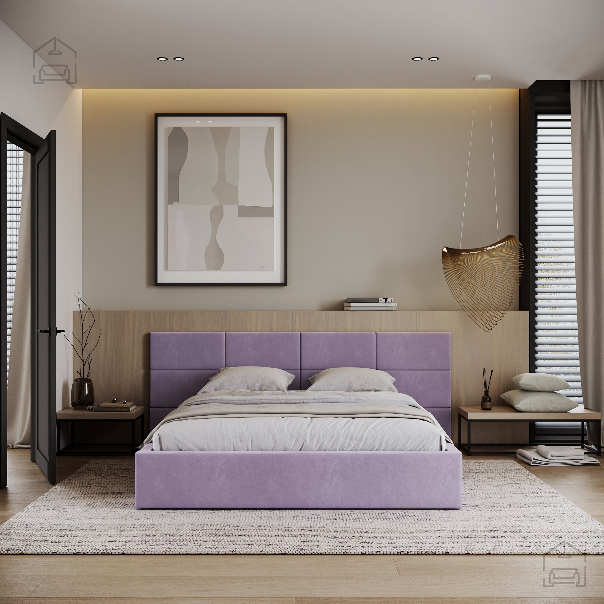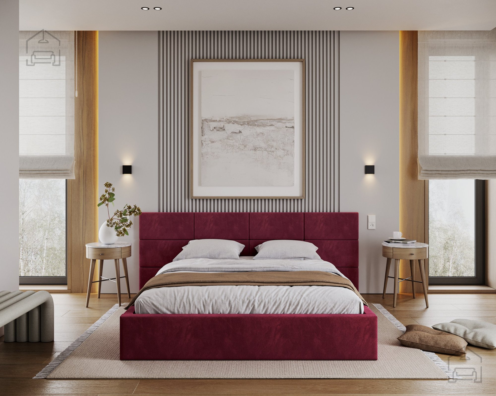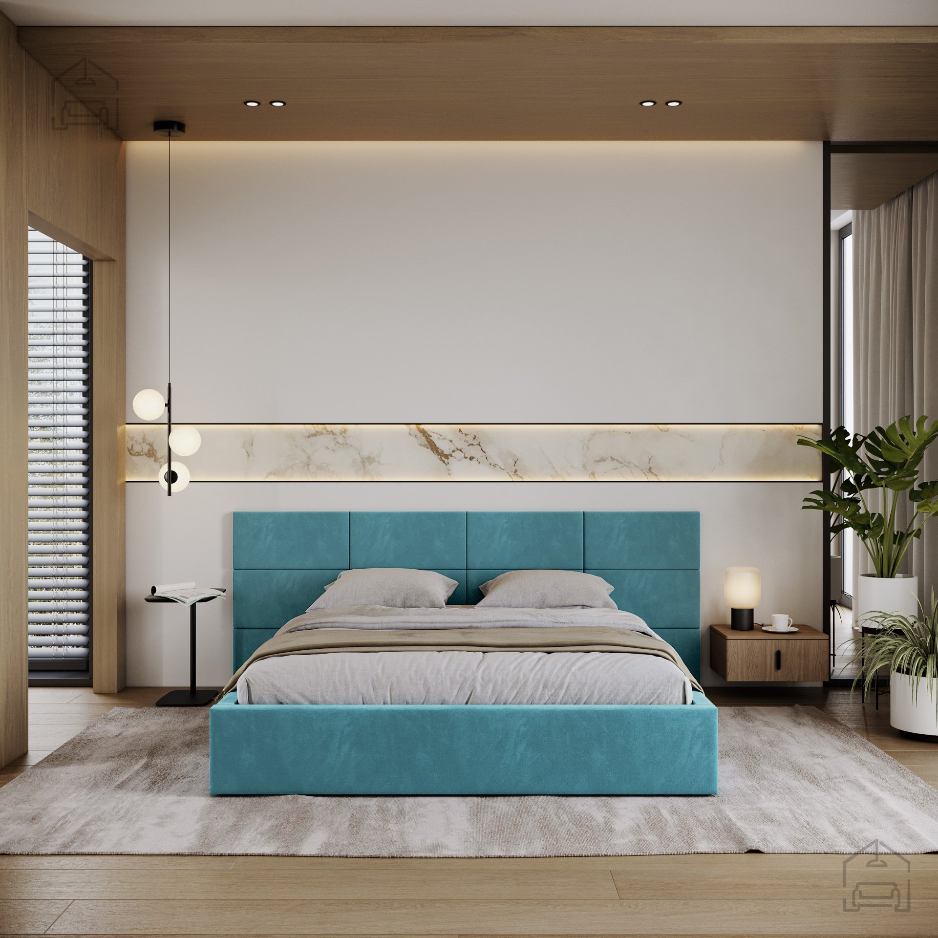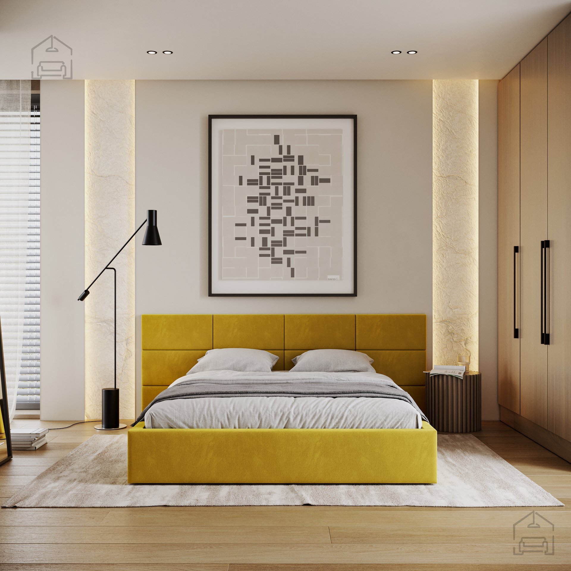 Ein besonderes Merkmal des Bettes Denver ist das aus Würfeln bestehende Kopfteil, das direkt an der Schlafzimmerwand montiert werden muss. Ein solcher modularer Ansatz ermöglicht mehr Freiheit bei der Gestaltung des Erscheinungsbildes des Bettes und des Raumes. Die Würfel dienen nicht nur als dekoratives Element, sondern auch als weiche Stütze beim Lesen oder Fernsehen im Bett.