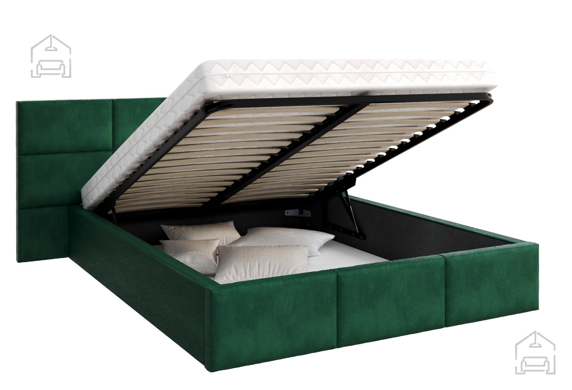Das Bett Denver ist mit einem Hebemechanismus aus Holz ausgestattet, der einen einfachen Zugang zu der geräumigen Bettzeugschublade ermöglicht. Diese Schublade stellt eine praktische Lösung für die Aufbewahrung von Decken, Kissen oder saisonaler Kleidung dar. Für diejenigen, die noch mehr Haltbarkeit und Leichtigkeit beim Heben wünschen, ist auch ein Stahl-Hebemechanismus gegen Aufpreis erhältlich. So kann der Benutzer zwischen zwei Ausführungen wählen, je nach seinen Bedürfnissen und Wünschen.