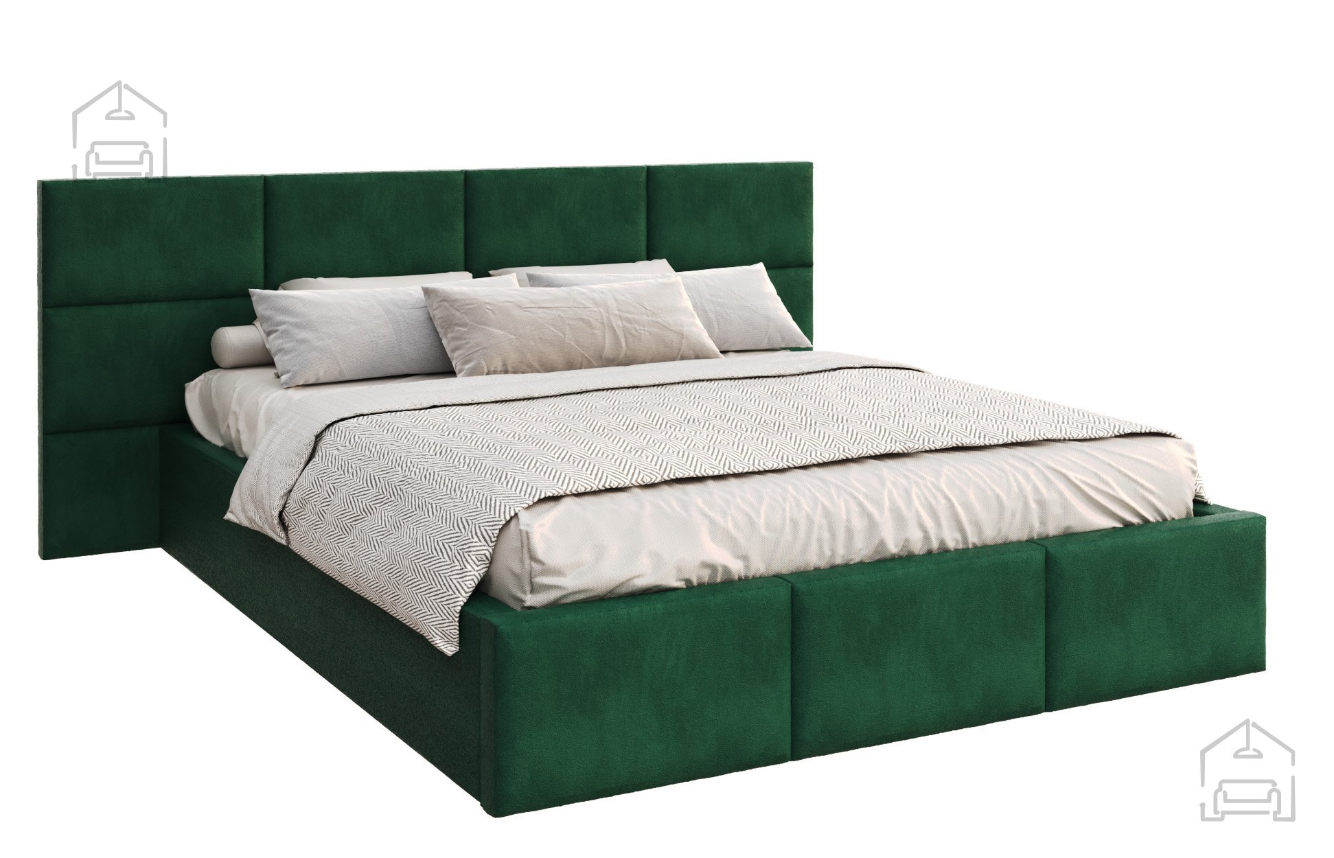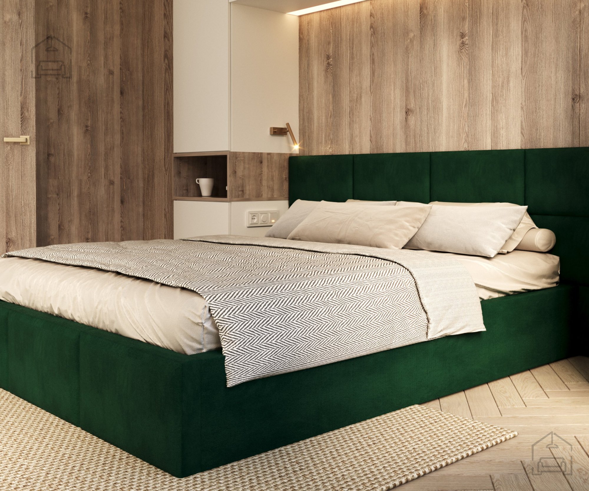 Der Bettrahmen ist gepolstert, was bedeutet, dass er mit einem weichen Stoff überzogen ist, der ein angenehmes Gefühl beim Berühren vermittelt. Auf dem Präsentationsbild ist das Material Trinity Bottle Green verwendet – ein eleganter grüner Stoff, der dem Raum Wärme und Raffinesse verleiht. Das Bett ist in mehreren Farben erhältlich, sodass es an verschiedene Einrichtungsstile angepasst werden kann.