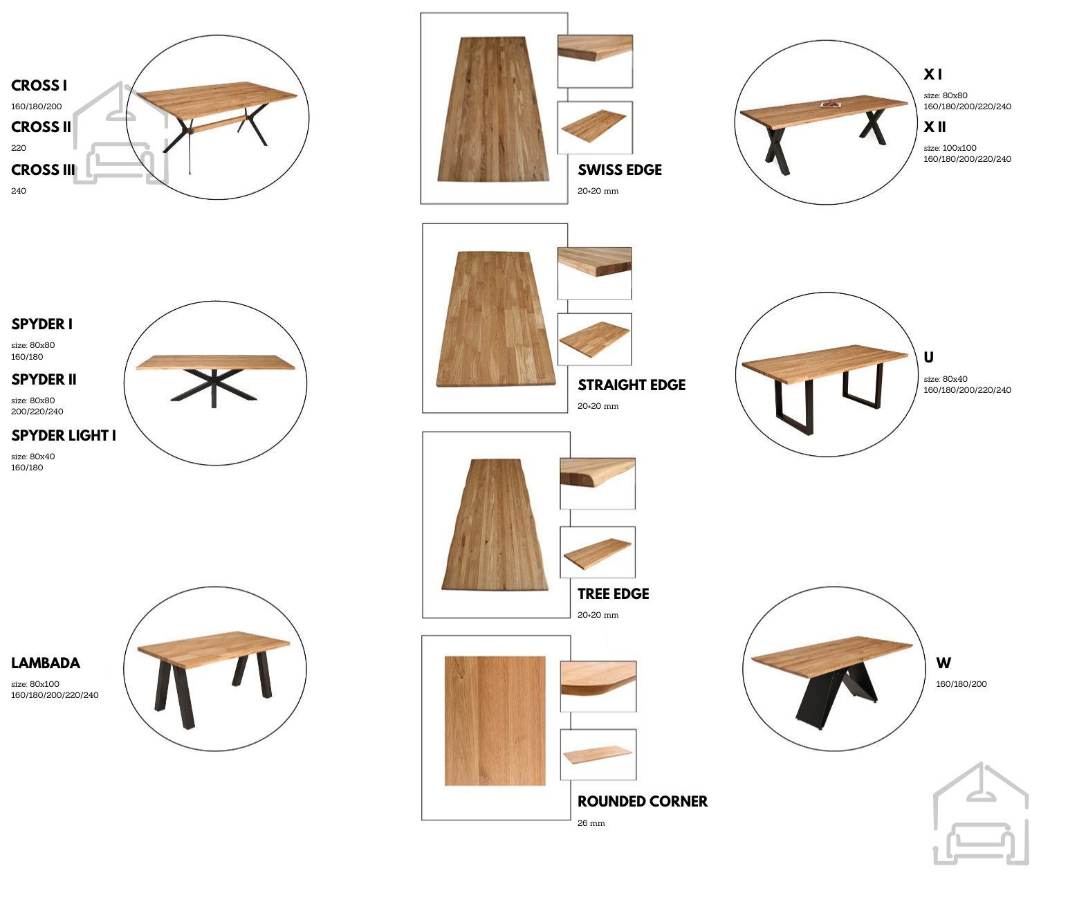 Platte mit gerader Kante (Dicke 40 mm), mit natürlicher Kante (Dicke 40 mm), Schweizer Kante (Dicke 40 mm), mit natürlicher Multi-Kante (Dicke 40 mm) sowie mit gemischter Kante (Dicke 20 + 20 mm).