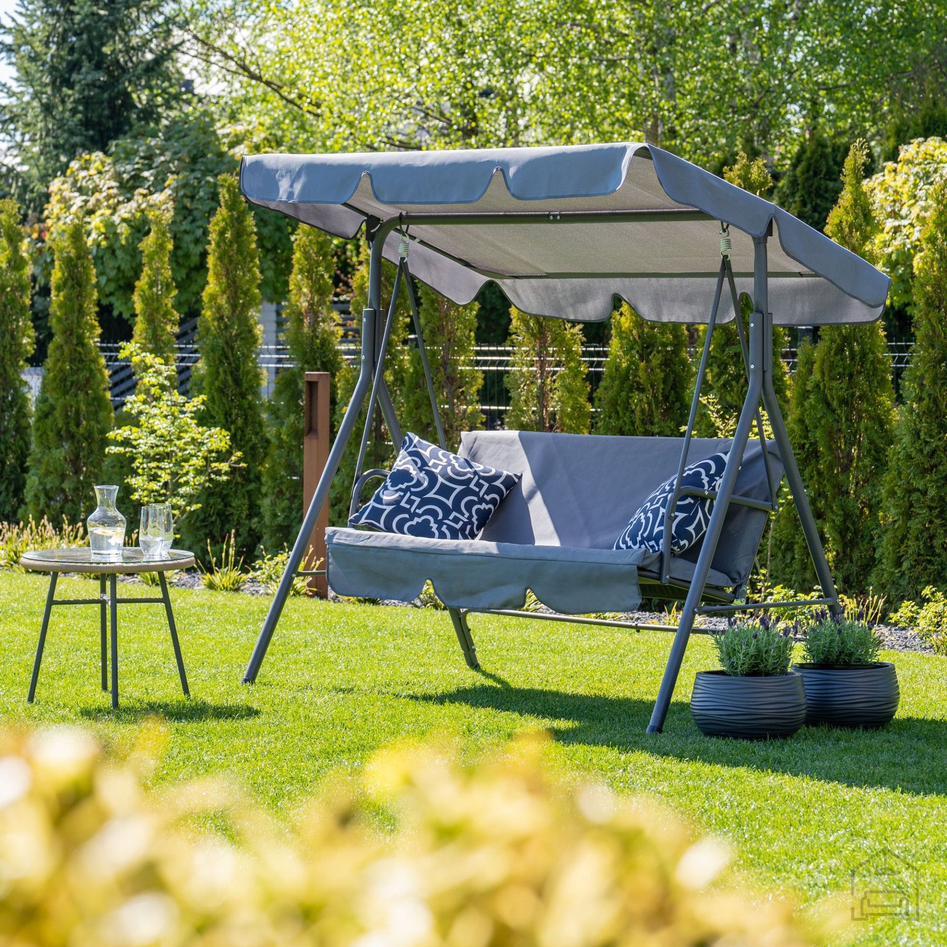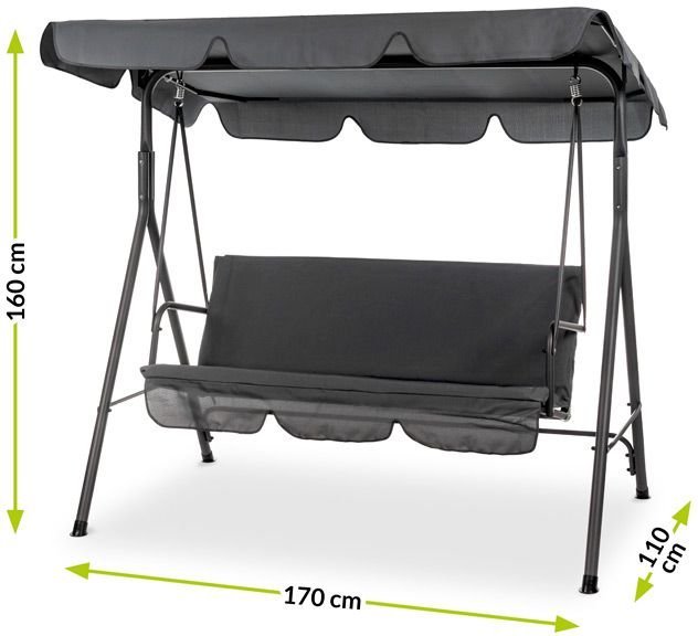 Die Gartenschaukel Eve ist eine hervorragende Wahl für alle, die Funktionalität, Komfort und ansprechendes Design schätzen. Ihre anthrazitfarbene Oberfläche wirkt modern und gleichzeitig dezent, sodass sie sich problemlos mit verschiedensten Gartenaccessoires kombinieren lässt – von Laternen über Kissen bis hin zu Outdoor-Teppichen. Dank ihrer Größe passt sie sowohl auf kleinere Terrassen als auch in großzügige Gärten oder auf größere Balkone. Durch die einfache Montage und das stabile Gestell ist sie rasch aufgebaut – und Sie können im Nu das sanfte Schaukeln und die wohlverdiente Entspannung genießen.