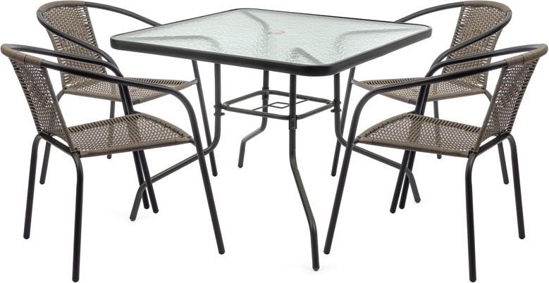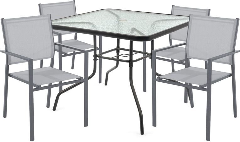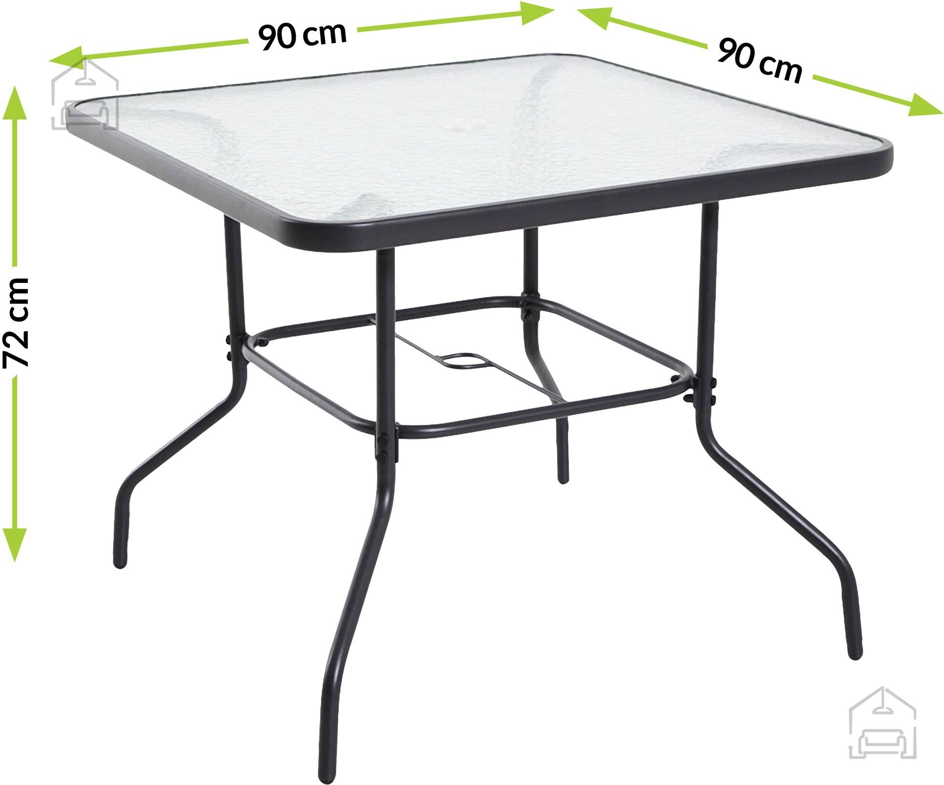 Mit den Maßen 90 × 90 × 68 cm nimmt der Tisch wenig Platz ein, bietet aber dennoch ausreichend Fläche für bis zu vier Personen. Die quadratische Form lässt sich ideal in Ecken von Balkonen oder Terrassen stellen, wo jeder Zentimeter zählt. In der Mitte der Tischplatte befindet sich eine Öffnung für einen Sonnenschirm, die eine stabile Befestigung ermöglicht und an heißen Tagen angenehmen Schatten spendet.