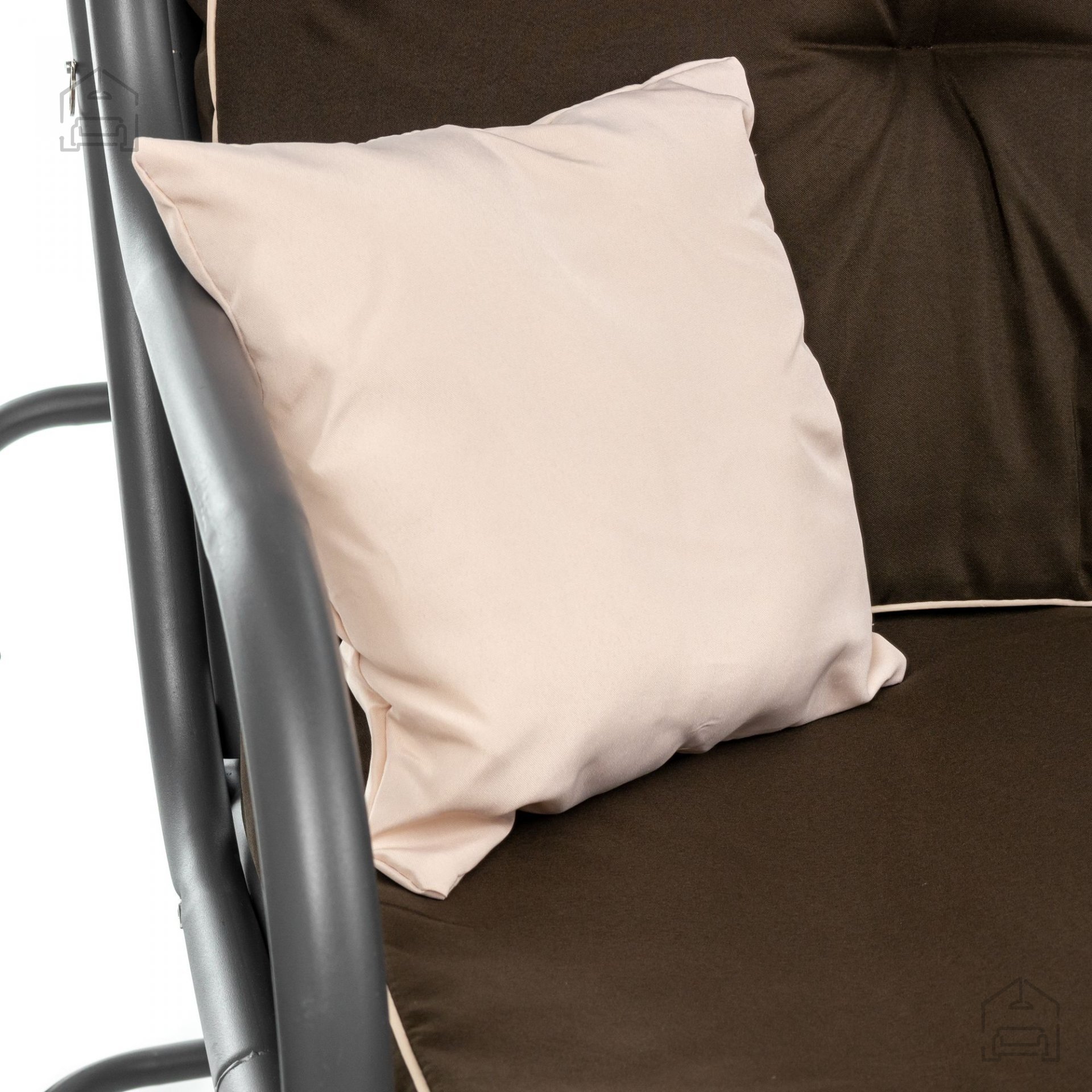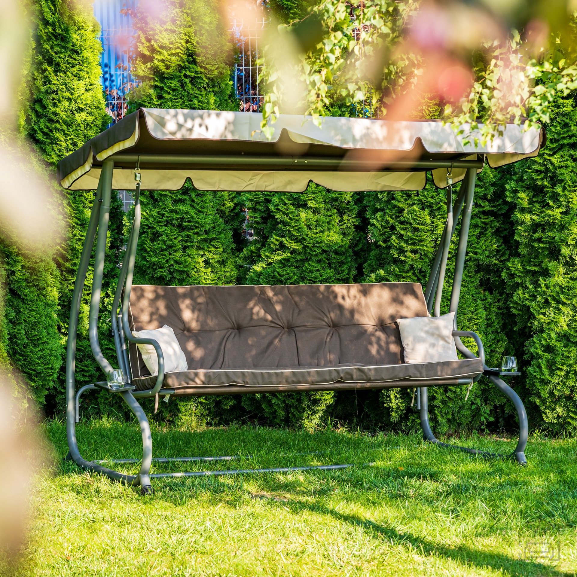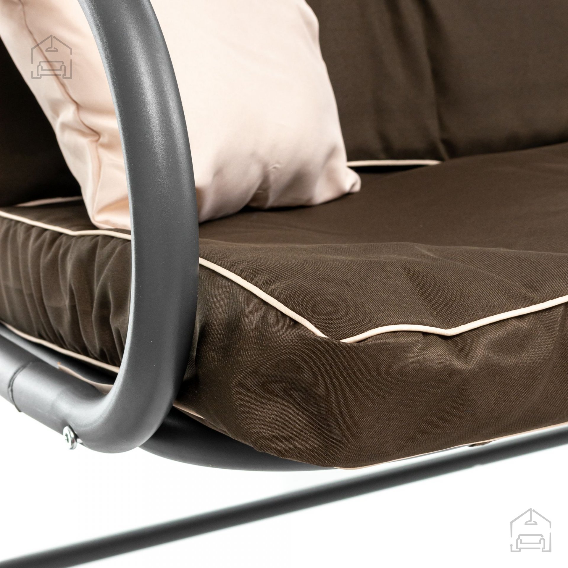 Die Gartenschaukel Megi in elegantem Schokoladenbraun ist die perfekte Wahl für alle, die ihren Außenbereich stilvoll und funktional gestalten möchten. Diese Schaukel ist nicht nur ein Möbelstück, sondern ein echter Ort der Entspannung und des Genusses auf Ihrer Terrasse oder im Garten. Mit den Maßen 220 x 130 x 170 cm bietet sie ausreichend Platz, um mehreren Personen gleichzeitig bequem Platz zu bieten.