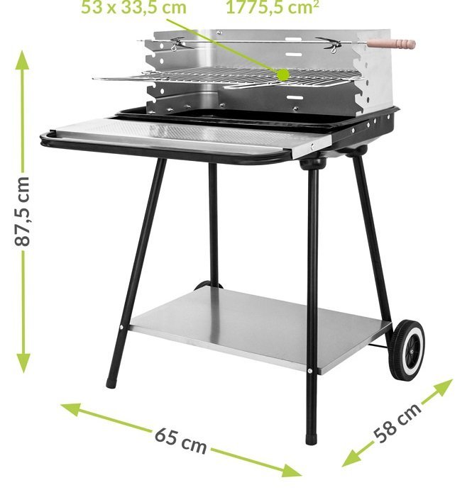 Rechteckiger Grill mit höhenverstellbarem Rost und Spieß. Die große Grillfläche von 1775,5 cm² bietet genug Platz, um mehrere Speisen gleichzeitig zuzubereiten – perfekt für gemütliche Gartenrunden. Der Grill eignet sich ebenso gut für den Einsatz auf der Parzelle oder beim Camping. Dank seiner kompakten Größe lässt er sich leicht transportieren. Die Grillwanne besteht aus emailliertem Stahl, das Windschutzblech ist aus Stahl gefertigt. Der verchromte Rost ist ideal für den täglichen Gebrauch.