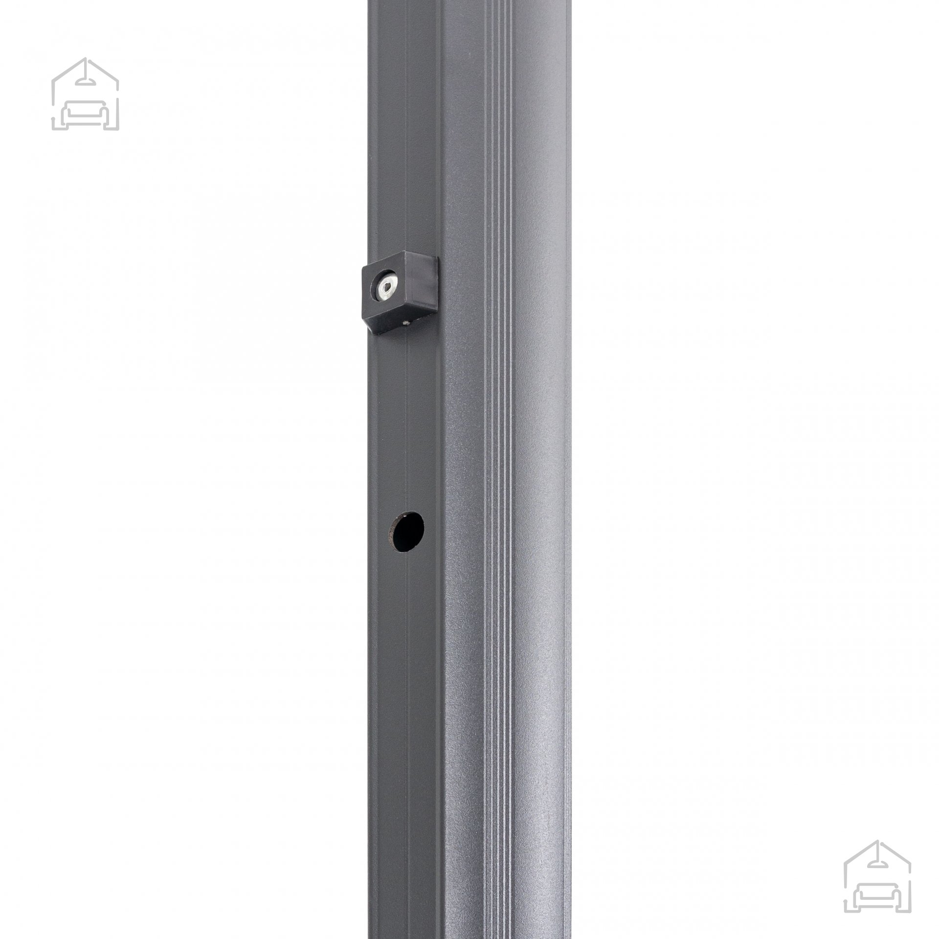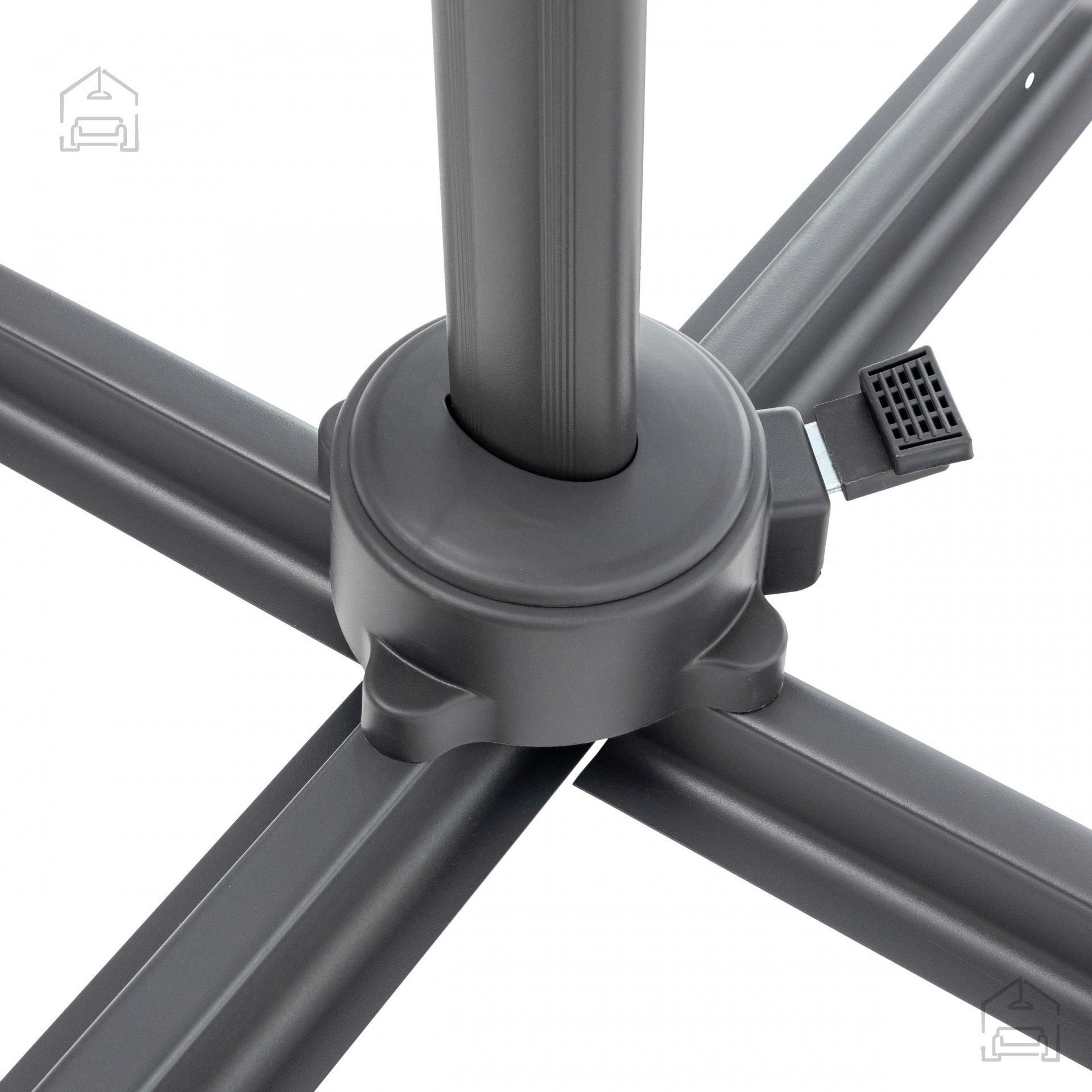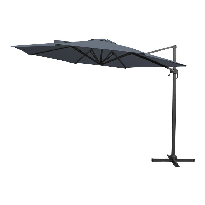 Praktischer Gartenschirm in elegantem Graphitton mit einem Schirmdurchmesser von 3,5 Metern. Die seitliche Konstruktion in Kombination mit der großzügigen Dachfläche sorgt für angenehmen Schatten auf einer großen Fläche. Der Schirmmast besteht aus Aluminium – einem Material mit hoher Korrosionsbeständigkeit, wodurch die Konstruktion besonders langlebig ist. Das Schirmdach aus Polyester eignet sich ideal für den Einsatz im Freien. Dank der Kurbel lässt sich der Schirm bequem öffnen und schließen. Mit dem Neigungsverstellungssystem und dem drehbaren Fuß kann der Schirm optimal an Ihre Bedürfnisse angepasst werden. Für Stabilität sorgen acht Streben im Dach sowie ein Kreuzfuß als Basis.