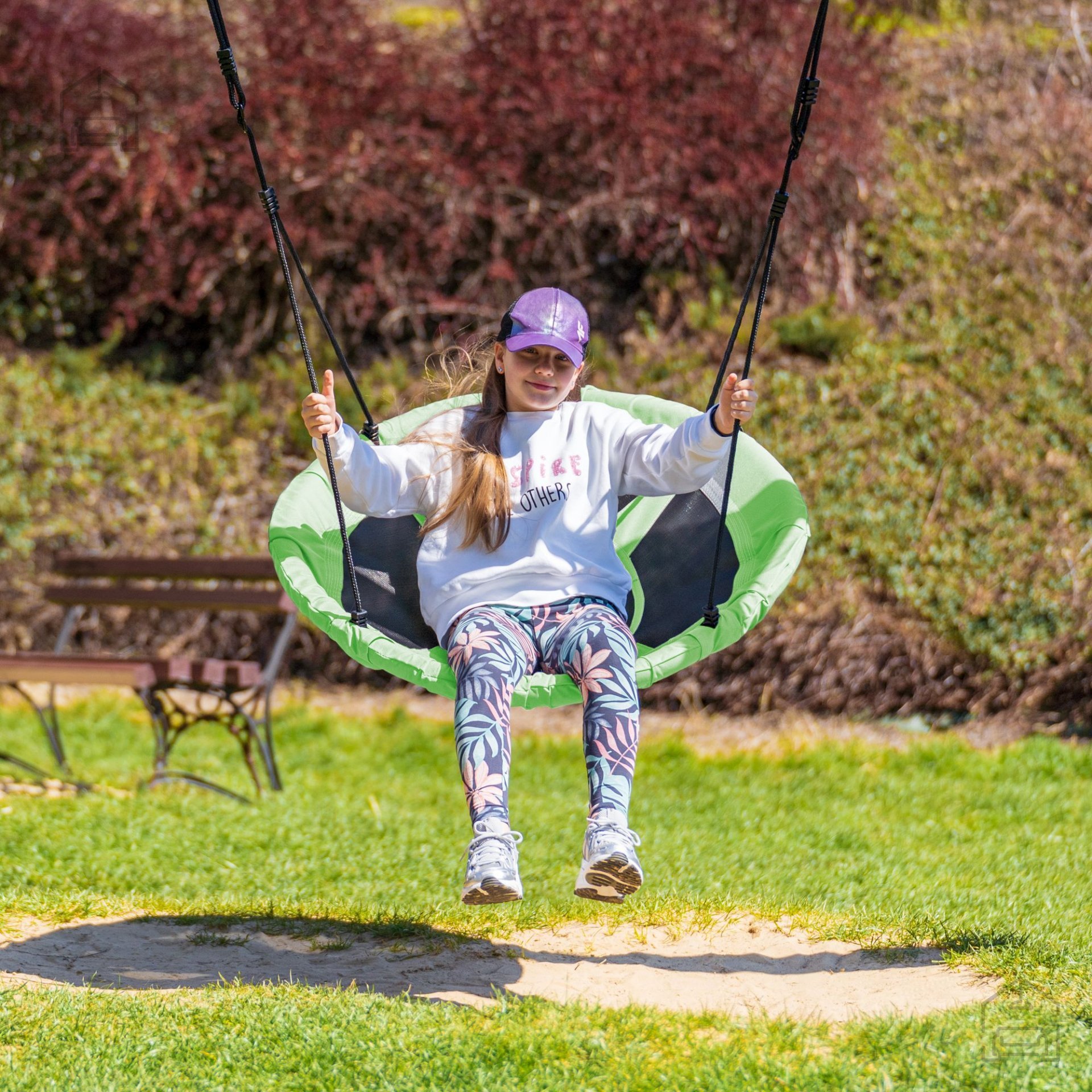 Die grüne Farbe der Nest-Schaukel harmoniert wunderbar mit den natürlichen Farbtönen von Pflanzen, Holz und Stein und fügt sich mühelos in jeden Gartentyp ein – vom klassischen Landhausstil bis zum modernen, minimalistischen Design. Dank des leichten Rahmens lässt sie sich bei Bedarf einfach umstellen, was besonders praktisch ist, wenn Sie den Garten neu gestalten oder saisonal verändern möchten. Die Schaukel ist nicht nur ein Möbelstück, sondern auch ein gemütlicher Platz zum Entspannen, Spielen und Zusammensein.