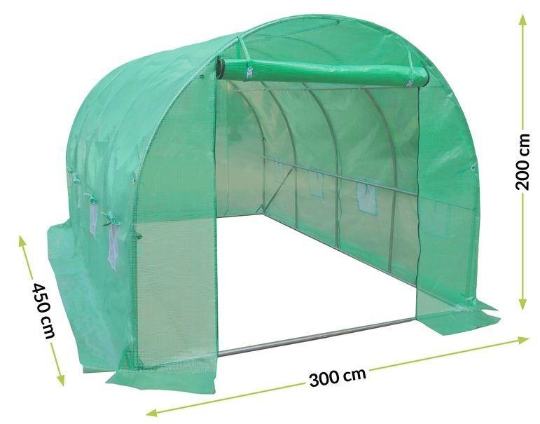 Genießen Sie das ganze Jahr über das Kultivieren Ihrer Pflanzen mit unserem hochwertigen Garten-Gewächshaus. Mit den Maßen 300 x 450 x 200 cm bietet es reichlich Platz für Ihre Gartenprojekte, während die robuste Stahl- und PVC-Konstruktion eine lange Lebensdauer garantiert.